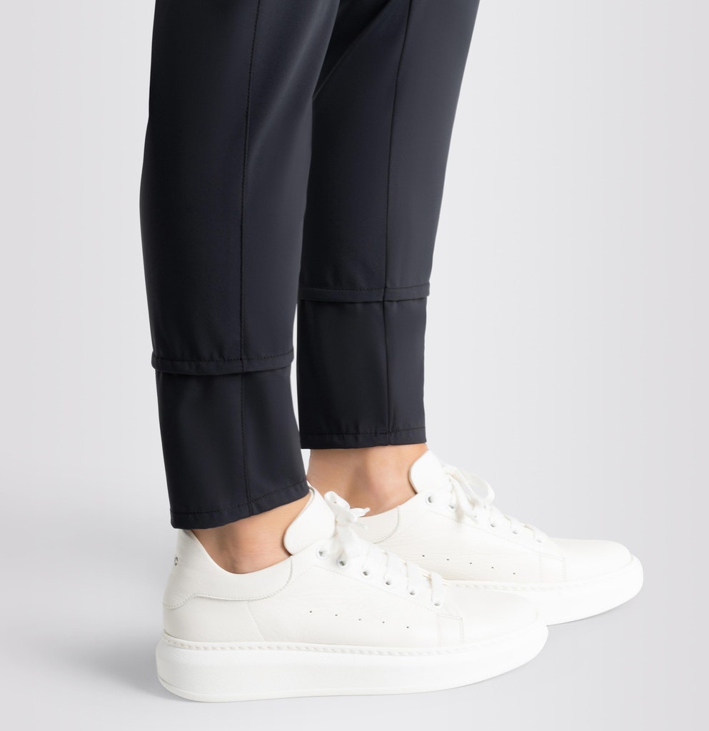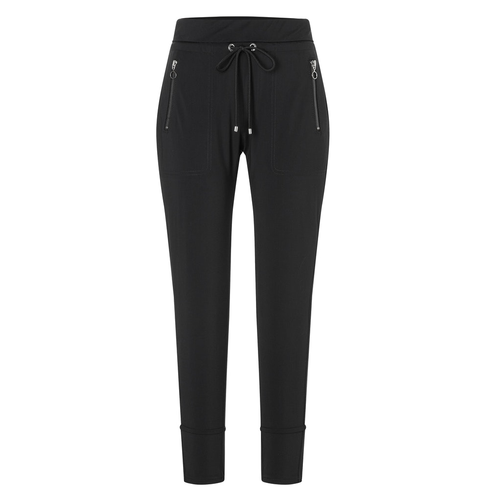 Relaxed Slim Fit, Tapered Leg, schmal zulaufendes Bein, verkürzte Länge, leicht erhöhte Leibhöhe, bequeme Taille, Bund mit Tunnelzug, Jump In-Modell, moderne Reißverschluss-Taschen vorne, Premium Techno Stretch, hochwertige, sehr elastische Ganzjahres-Qualität, fließender Fall im Material, sehr angenehm auf der Haut, langlebige Qualität, sportiver, abwechslungsreich kombinierbarer Look, knitterarme Eigenschaften, pflegeleicht, hoher Tragekomfort, Das Model ist 1,75m groß und trägt die MAC Hosengröße 36, Fußweite bei Größe 36: 27cm