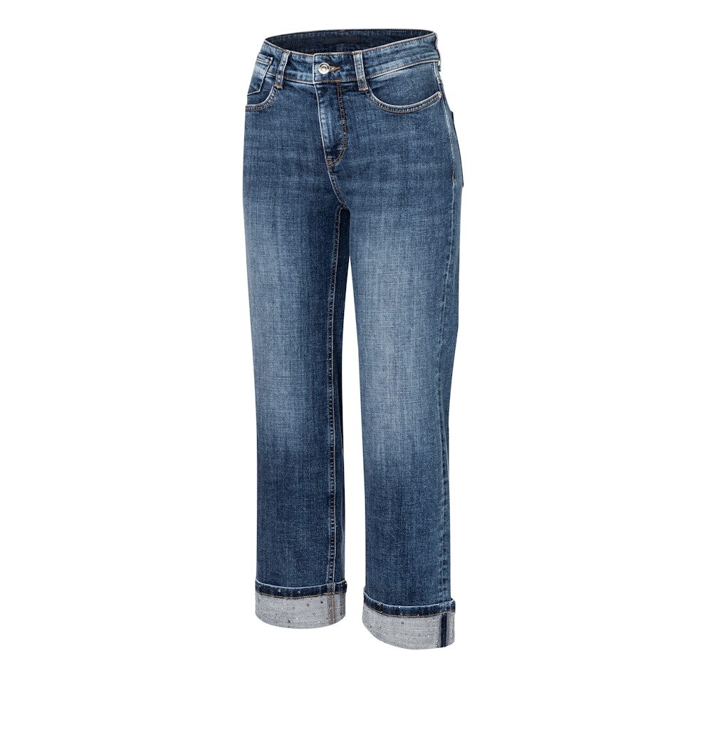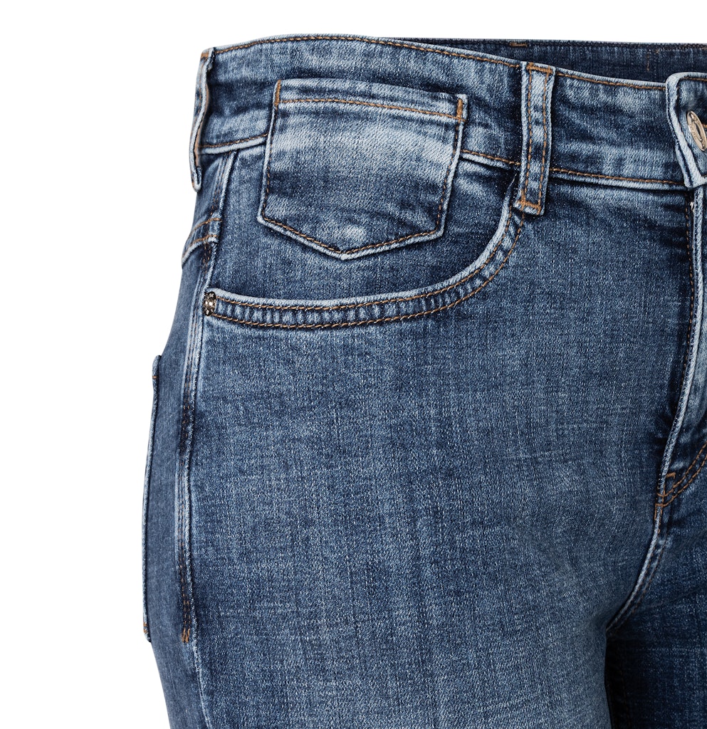Flared Fit, ausgestelltes Bein, mittlere Leibhöhe, bequeme Taille, Five Pocket, moderne Naht-Details hinten, gekrempelter Saum, feine Plättchen-Schmücker an den Gesäßtaschen und am Aufschlag, Authentic Comfort Stretch Denim, hochwertige Denim-Qualität mit hohem Tragekomfort, strukturierte Optik, authentische Vintage-Waschung, angenehmer Griff, Das Model ist 1,75m groß und trägt die MAC Hosengröße 36, Fußweite bei Größe 36: 44cm