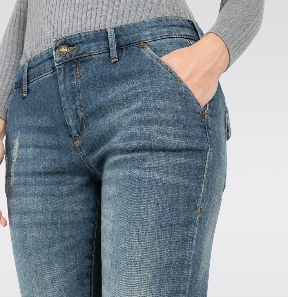 Slim Fit, schmales, zulaufendes Bein, verkürzte Länge, mittlere Leibhöhe, Chino-Modell, seitliche Eingrifftaschen vorne, aufgesetzte Klappentaschen mit Knopf hinten, Riegel-Detail mit Knöpfen hinten, moderne Destroyed-Effekte, dezent umgeschlagener Saum, Authentic Comfort Vintage Denim, hochwertiger, elastischer Denim mit hohem Baumwoll-Anteil, authentische Vintage-Optik, angenehmer Griff, hervorragende Passform und Schnittführung zur Betonung von Beine und Po, hoher Tragekomfort, über Better Cotton gesourcte Baumwolle, Das Model ist 1,75m groß und trägt die MAC Hosengröße 36, Fußweite bei Größe 36: 32cm