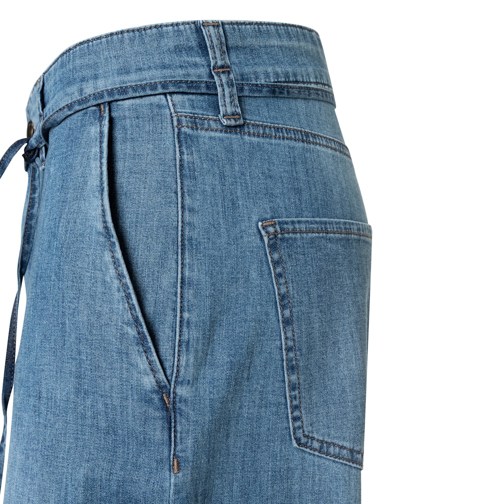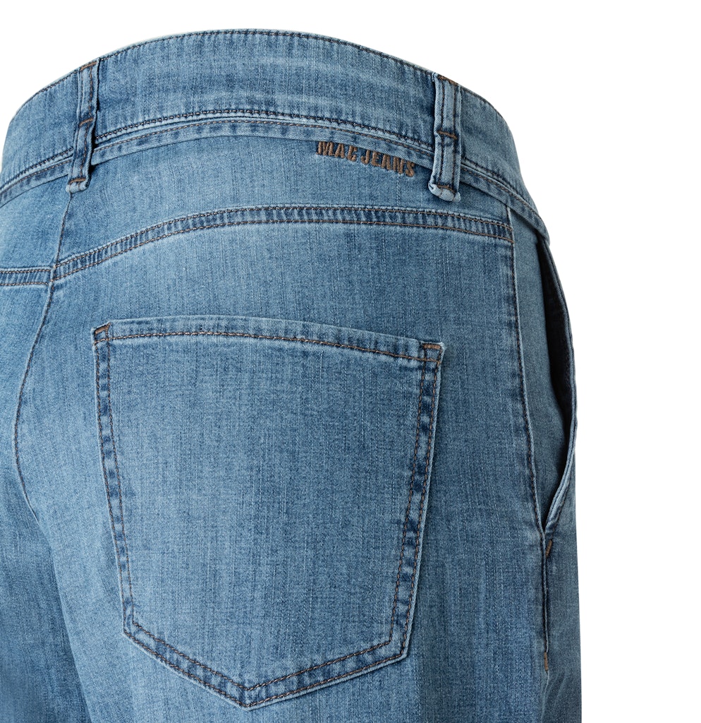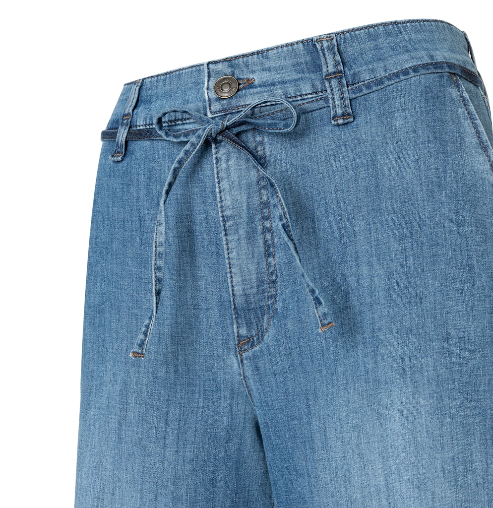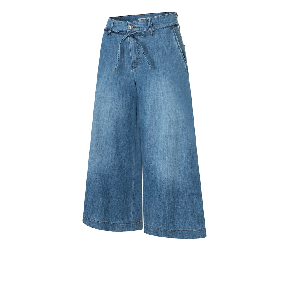 Wide Fit, Wide Leg, gerades, weites Bein, verkürzte Länge, Culotte, mittlere Leibhöhe, bequeme Taille, bequem an Gesäß und Oberschenkel, seitliche Eingrifftaschen, aufgesetzte Taschen hinten, feiner Bindegürtel am Bund, Super Light Denim, sehr leichte, sommerliche 5.75 oz Denim-Qualität mit hohem Baumwoll-Anteil, softer Griff, authentische Optik, hervorragende Passform, Das Model ist 1,75m groß und trägt die MAC Hosengröße 36, Fußweite bei Größe 36: 66cm