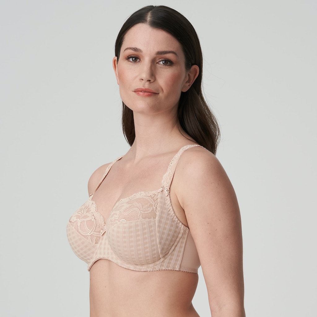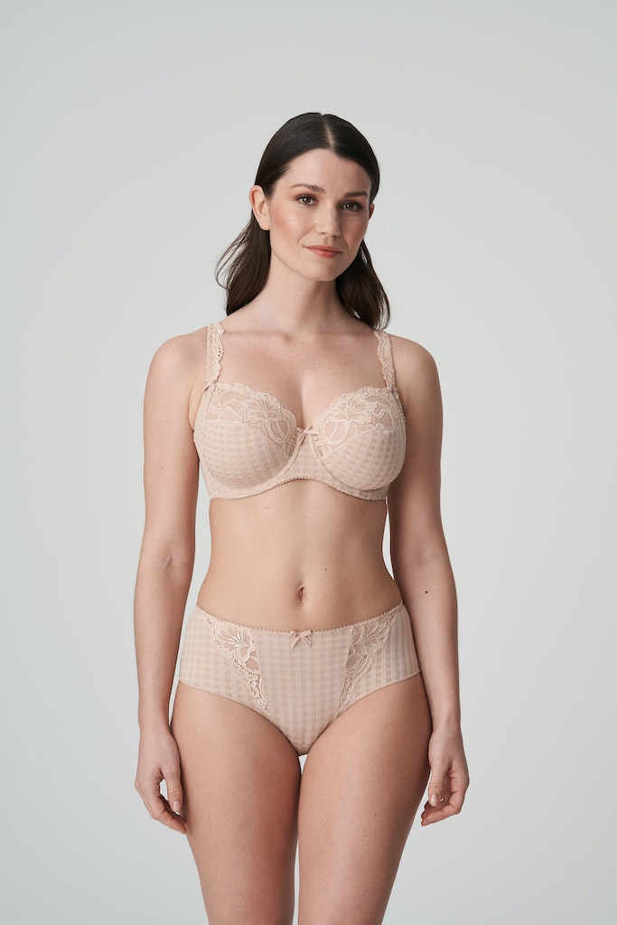 Dreiteiliger Vollschalen-BH aus einem karierten Stoff mit betörender Spitze an Dekolleté und Trägern.