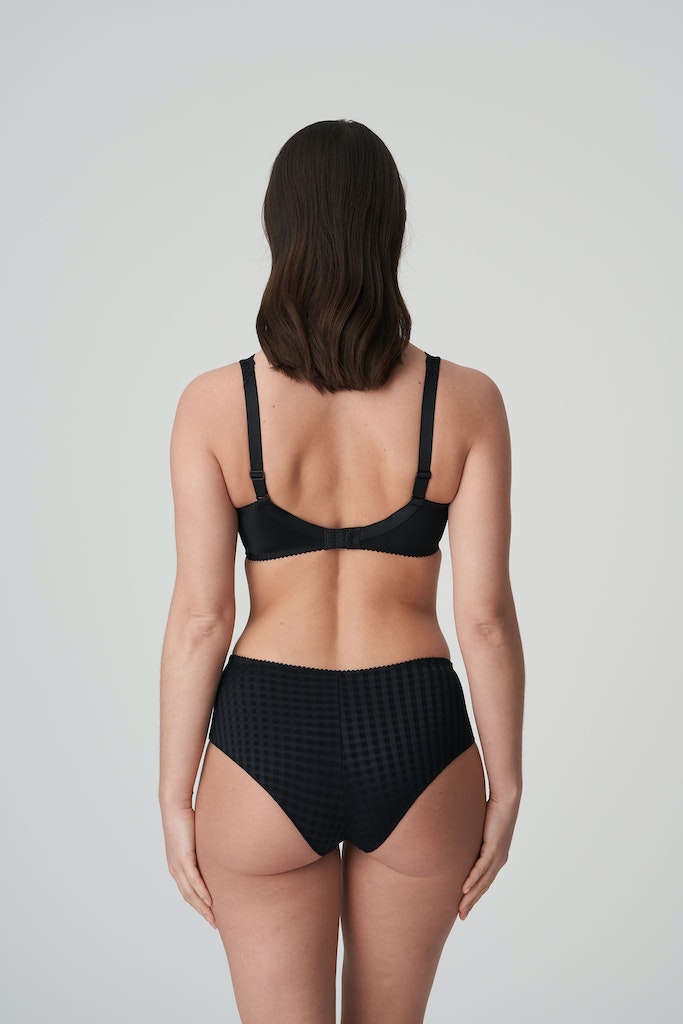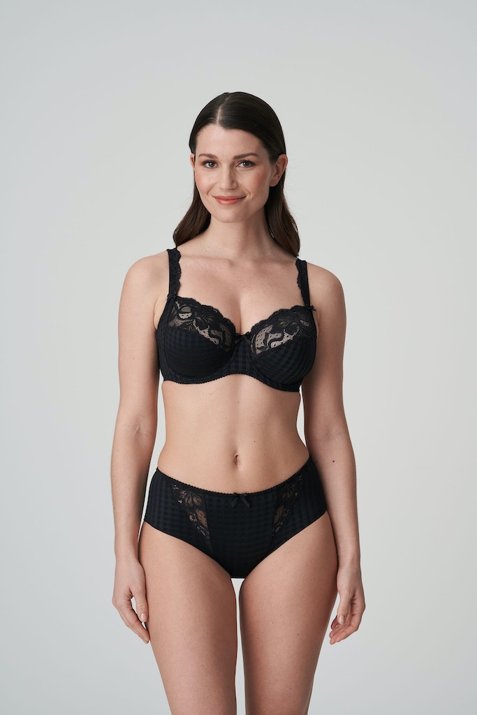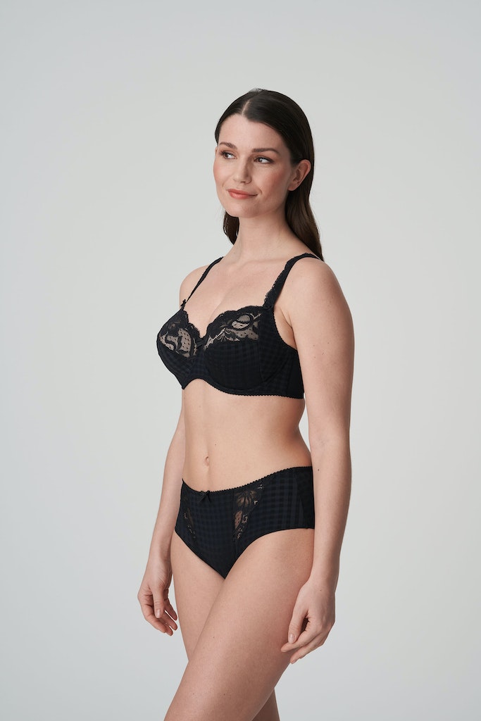 Dreiteiliger Vollschalen-BH aus einem karierten Stoff mit betörender Spitze an Dekolleté und Trägern.