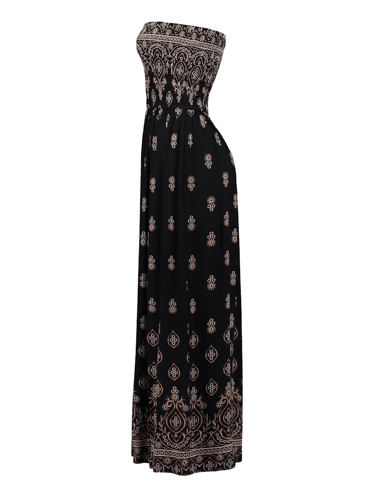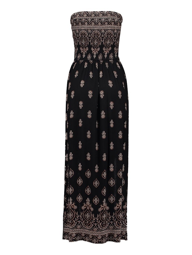 Maxi-Kleid ohne Träger und mit gesmoktem Oberteil.