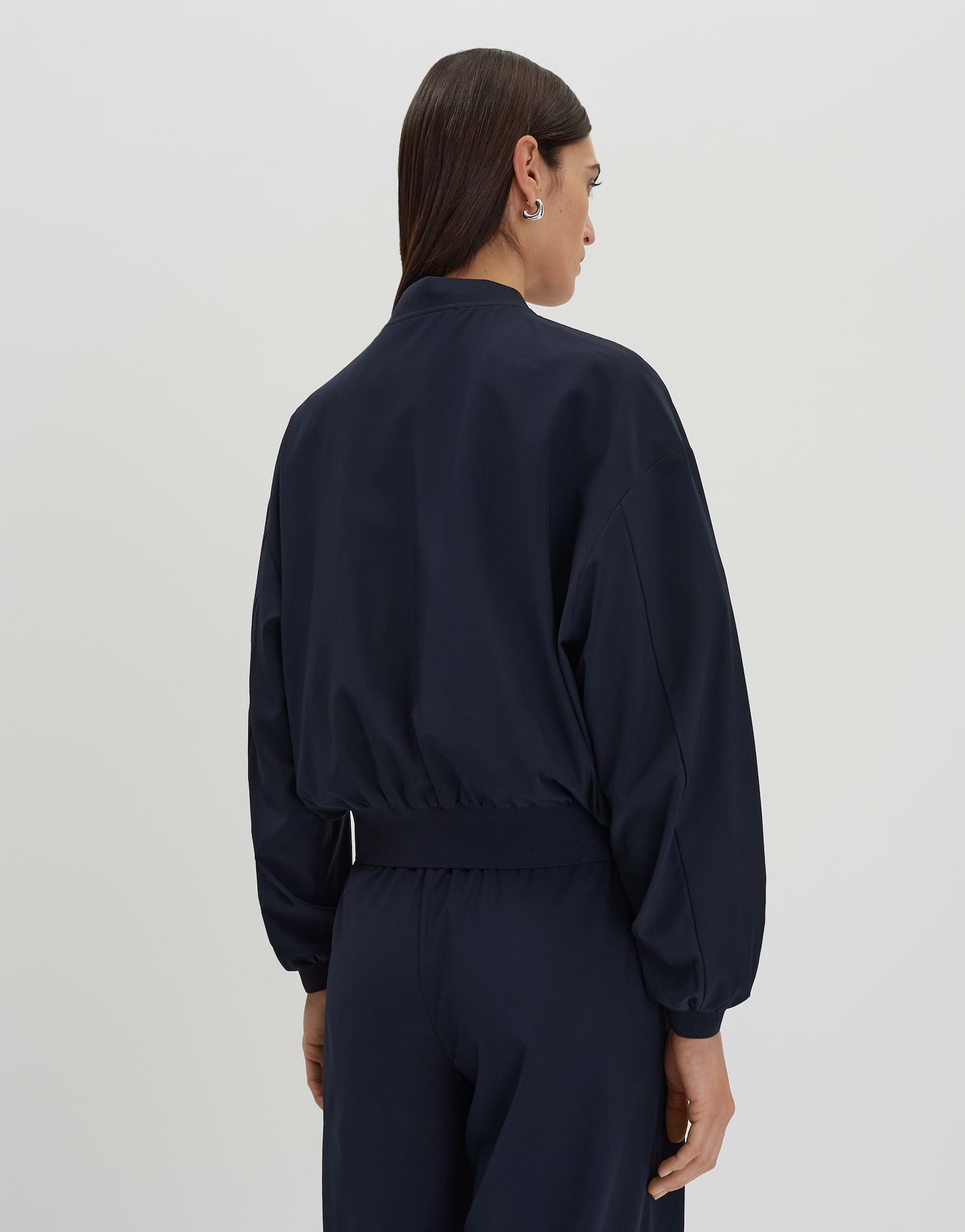 normale Passform, schmal zulaufend, verkürzte Länge, Langarm, Blousonkragen, Rückenlänge ca. 54,5 cm bei Größe 36, Model Größe 177 cm - trägt Größe 36, Jersey, Piqué Optik, natürlicher Griff, fließender Fall, ungefüttert, gerippte Bündchen, verdeckte Knopfleiste