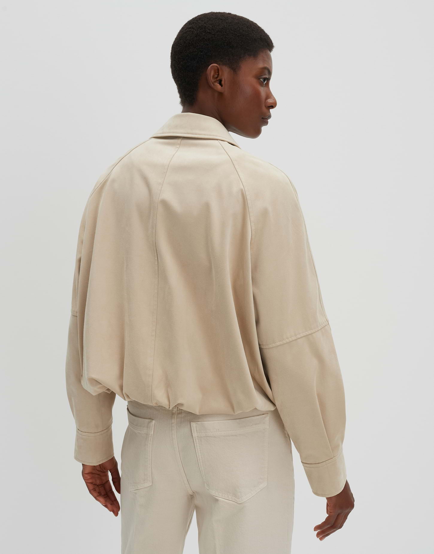 lockere Passform, ovaler Schnitt, verkürzte Länge, Langarm, Umlegekragen, Rückenlänge ca. 54 cm bei Größe 36, Model Größe 175 cm - trägt Größe 36, Velourslederimitat, glattes Innenfutter, fester Griff, samtige Oberfläche, schräge Eingrifftaschen, geraffter Ballonsaum, Knopfleiste, abgesteppte Teilungsnähte