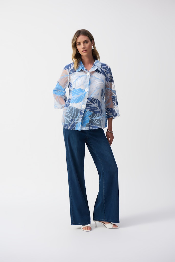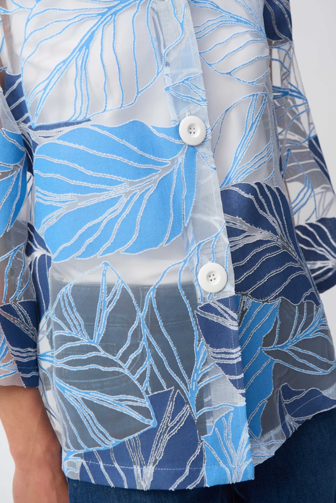 Diese Jacke ist eine Neuheit und mit einer solchen Finesse ausgearbeitet, dass Sie ihrem zeitlosen Charme nicht widerstehen können. Ein hübscher Blätter-Print ziert das Kleidungsstück mit seiner schicken Trapez-Silhouette und einem Knopfverschluss. Der leicht geraffte Kragen und die Dreiviertel-Glockenärmel unterstreichen das exquisite moderne Design.