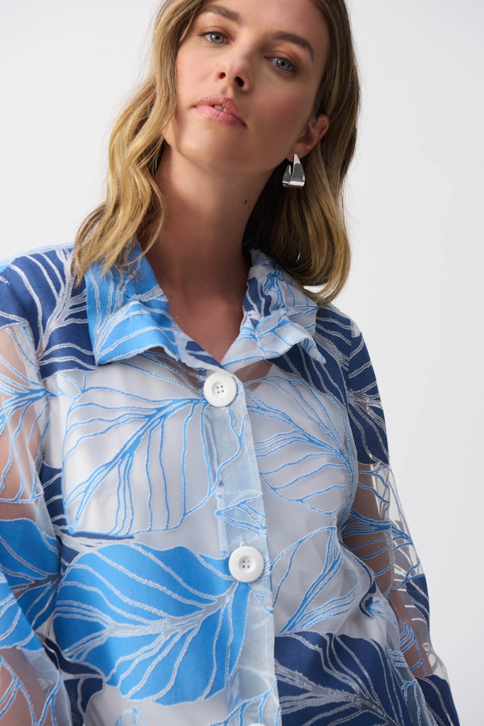 Diese Jacke ist eine Neuheit und mit einer solchen Finesse ausgearbeitet, dass Sie ihrem zeitlosen Charme nicht widerstehen können. Ein hübscher Blätter-Print ziert das Kleidungsstück mit seiner schicken Trapez-Silhouette und einem Knopfverschluss. Der leicht geraffte Kragen und die Dreiviertel-Glockenärmel unterstreichen das exquisite moderne Design.