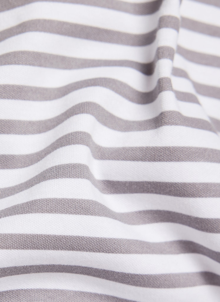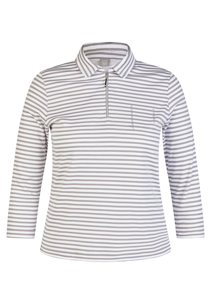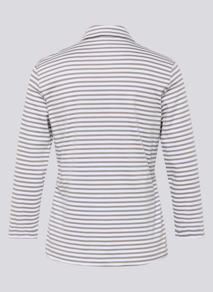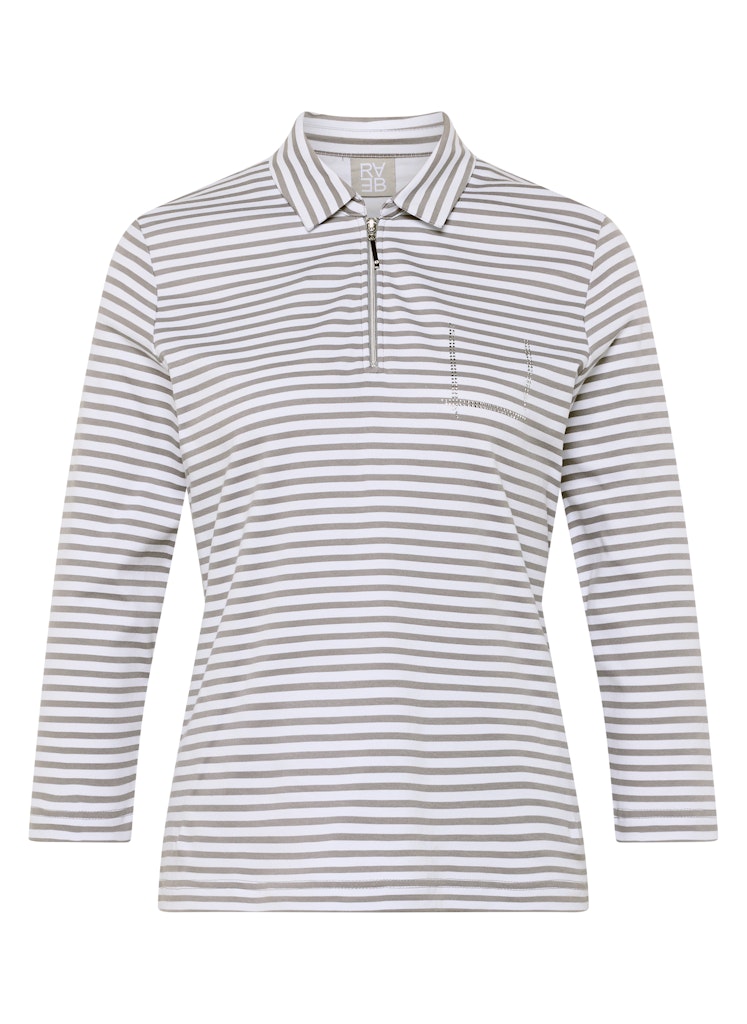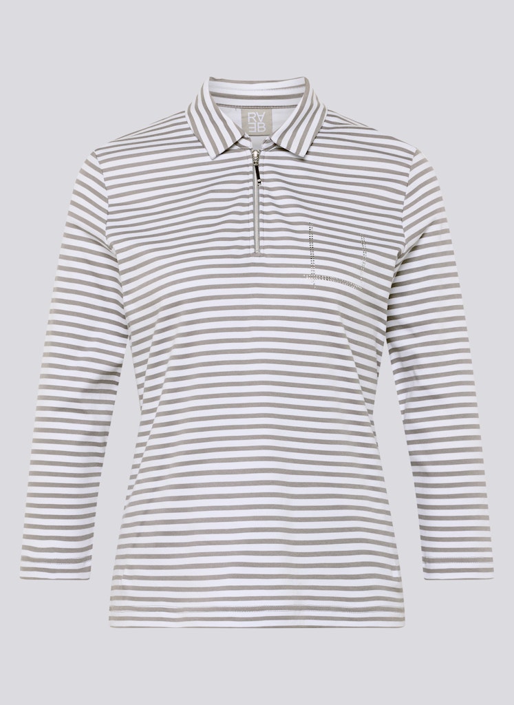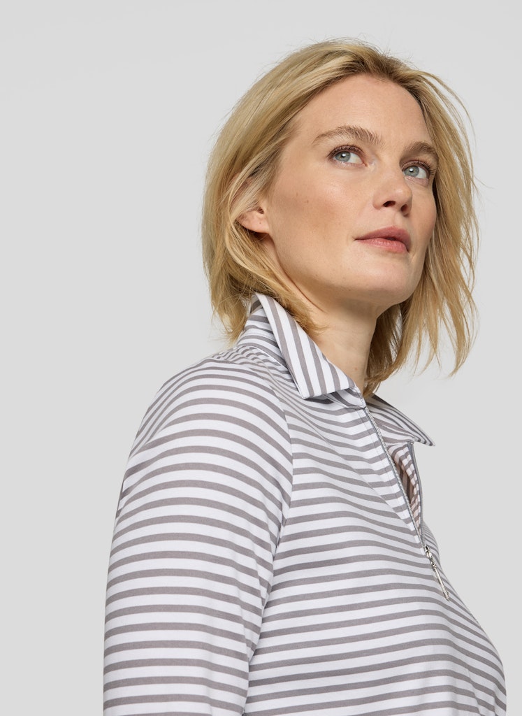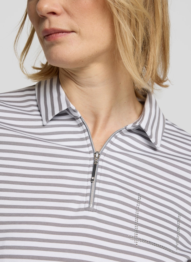 Das Ringelshirt kombiniert eine sportive Ausstrahlung mit einem femininen Detail. Polokragen und kurzer Reißverschluss verleihen dem Modell eine dynamische Note, während das feine Strassmotiv auf Brusthöhe einen dezenten Blickfang setzt. Die reine Baumwolle fühlt sich angenehm auf der Haut an und bietet hohen Tragekomfort. Dank der schmalen Form und der langen Ärmel lässt sich das Shirt vielseitig in moderne Alltags-Looks integrieren. Hautfreundliche Qualität. Polokragen mit Zipper. Strassdetail auf Brusthöhe. Schmale Passform.