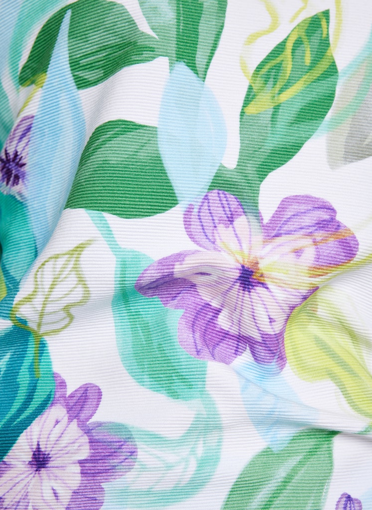 Das farbenfrohe Blumenmuster in Grün, Blau und Violett verleiht dem Oberteil eine lebendige und stilvolle Ausstrahlung. Die 3/4-Ärmel und der moderne Rundhalsausschnitt machen es zum perfekten Begleiter für jede Jahreszeit.Floraler Allover-Print für einen femininen Look.Angenehmes, elastisches Material für höchsten Tragekomfort. 3/4-Ärmel _ ideal für Übergangszeiten.Kombinierbar mit Jeans, Röcken oder Stoffhosen für vielseitige Outfits.