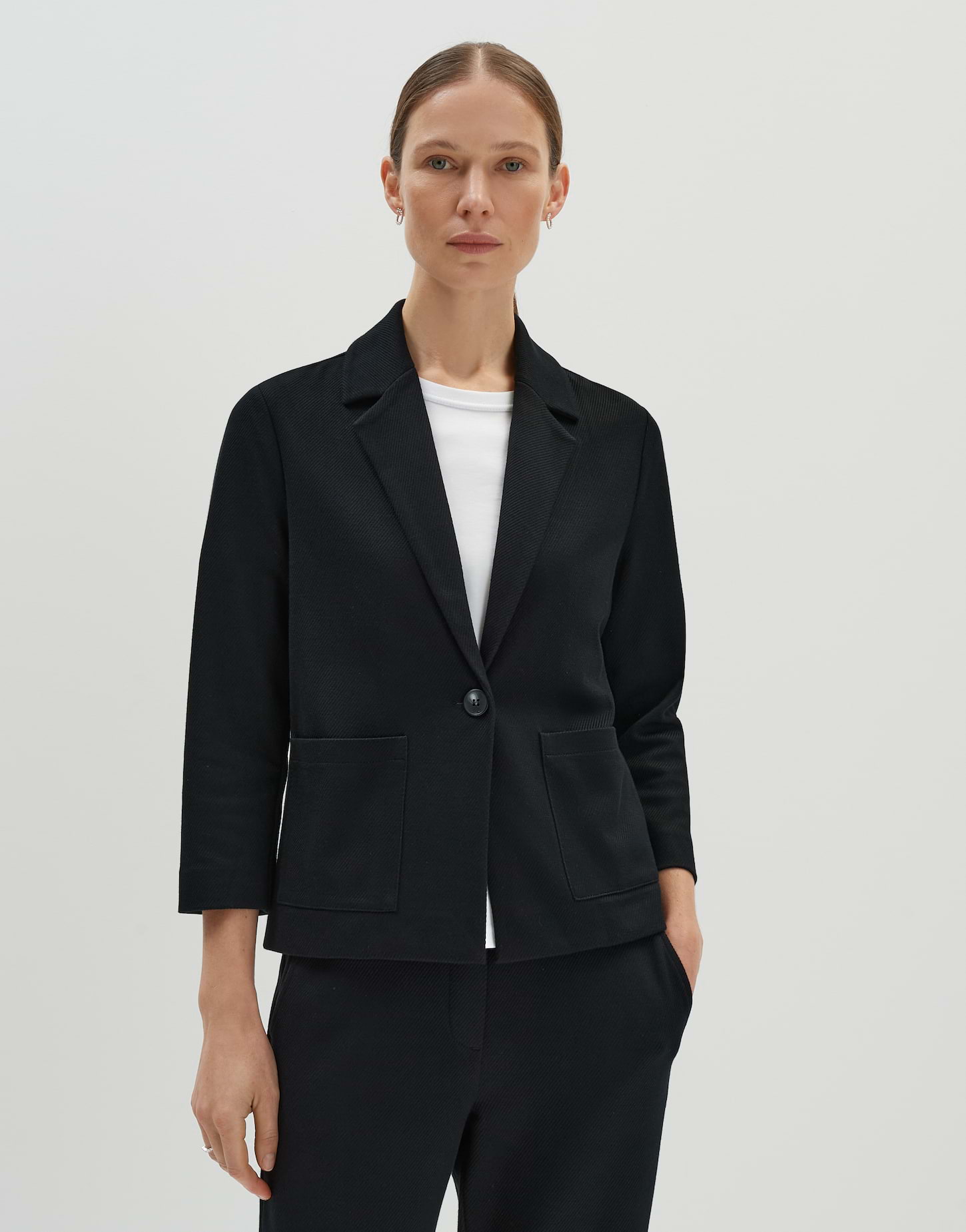 Blazer w collar and lapel, flap pockets and one button closure