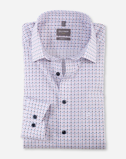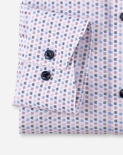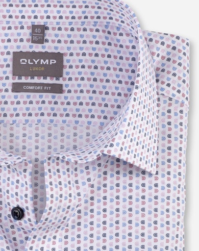 Smartes Minimal-Dessin in harmonischer Farbkomposition, der Frühling kann kommen. Der leichte Popeline aus feinen Baumwollgarnen macht dieses OLYMP Luxor zum Matchwinner im Office. Akzentuierung auf Rosé, smarter New Kent und angenehme Linienführung unterstützen die modische Performance. Zeitsparend pflege- und bügelleicht.