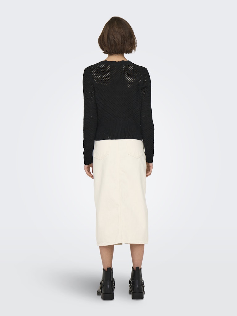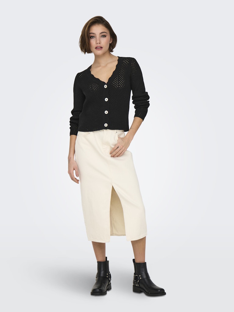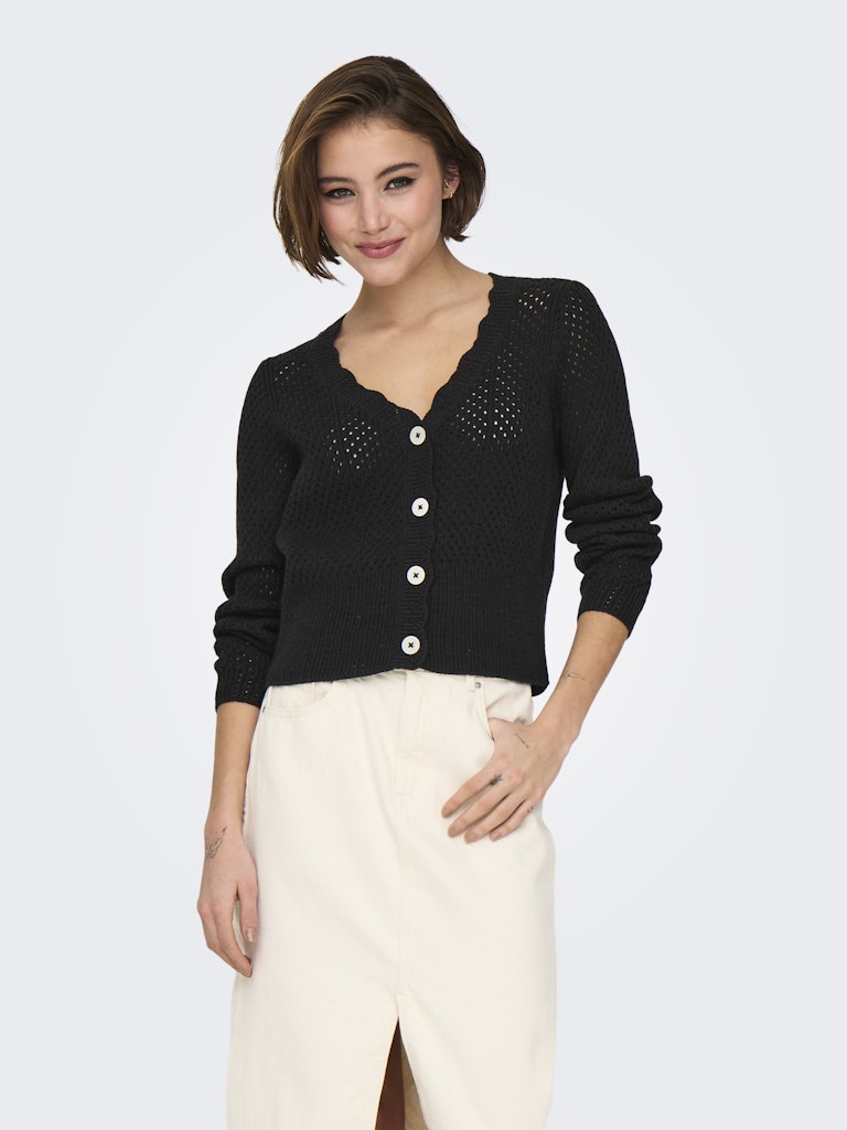 Vervollständige deinen Look mit einem zeitlosen, femininen Strickteil, das weich und warm ist. - Produkttyp : Strickjacke - Hals : V-Ausschnitt - Ärmel : Langarm - Manschetten : Gerippte Ärmelbündchen - Verschluss : Knopfleiste - Passform : Normal geschnitten