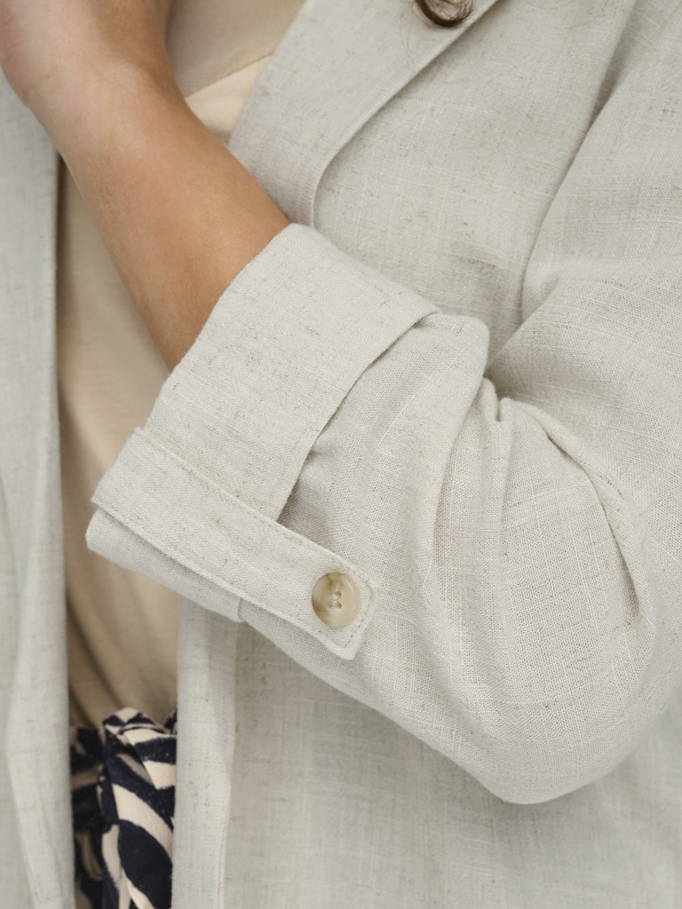 Genieße den Sommer und die Sonne in leichter, fließender Kleidung, die sich für den Alltag und besondere Anlässe eignet. - Produkttyp : Blazer - Hals : Reverskragen - Manschetten : Ärmelbündchen mit Knopf - Taschen : Taschen vorn - Länge/Größe : Lang - Passform : Locker geschnitten