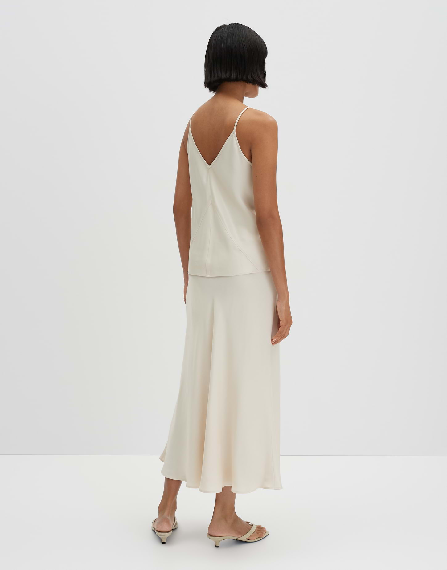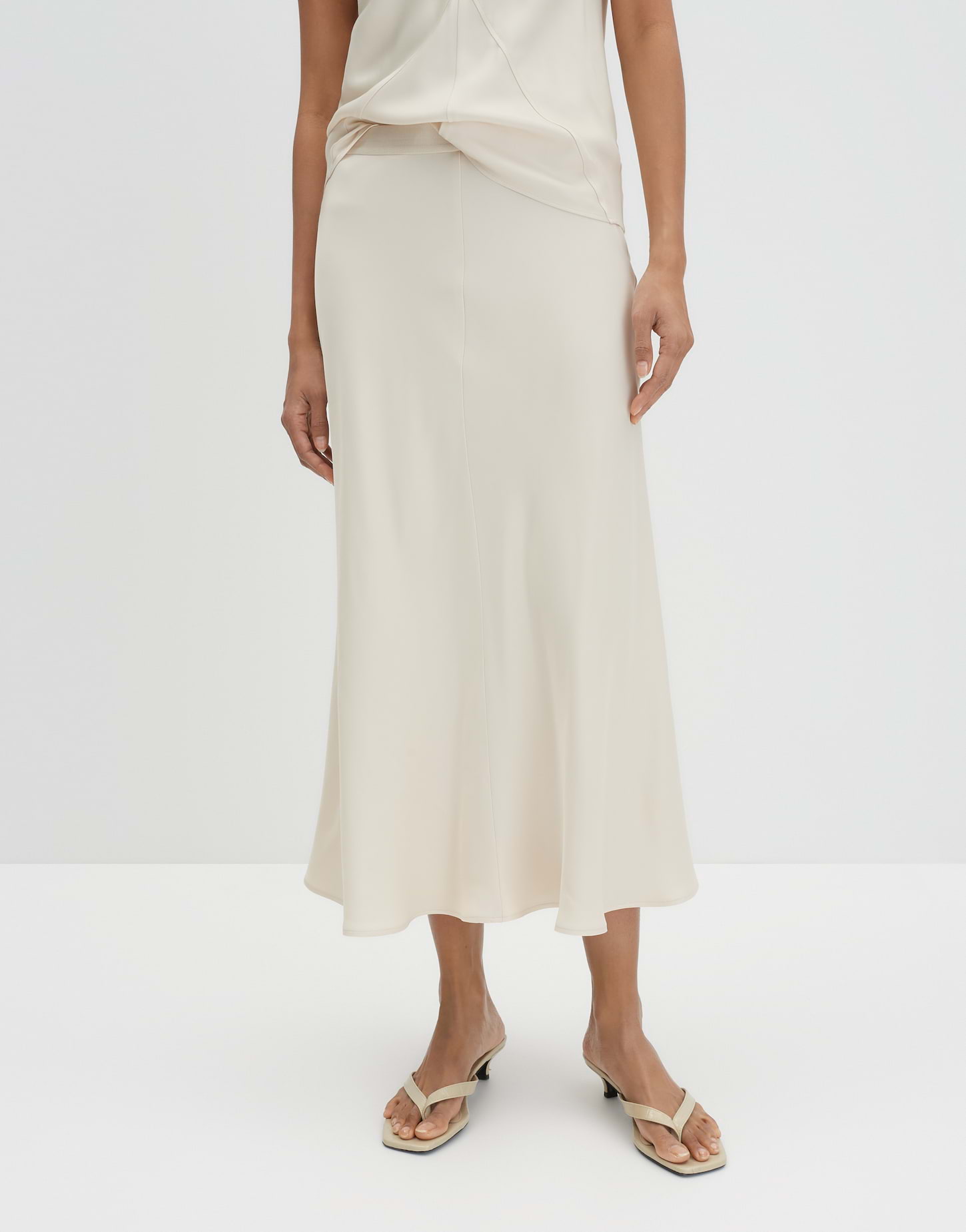 lockere Passform, leicht ausgestellt geschnitten, Midi-Länge, hintere Länge ca. 83 cm in allen Größen, Model Größe 176 cm - trägt Größe 36, Satin, glatter Griff, schimmernde Oberfläche, weich fließender Fall, elastischer Gummibund, vordere Längsnaht