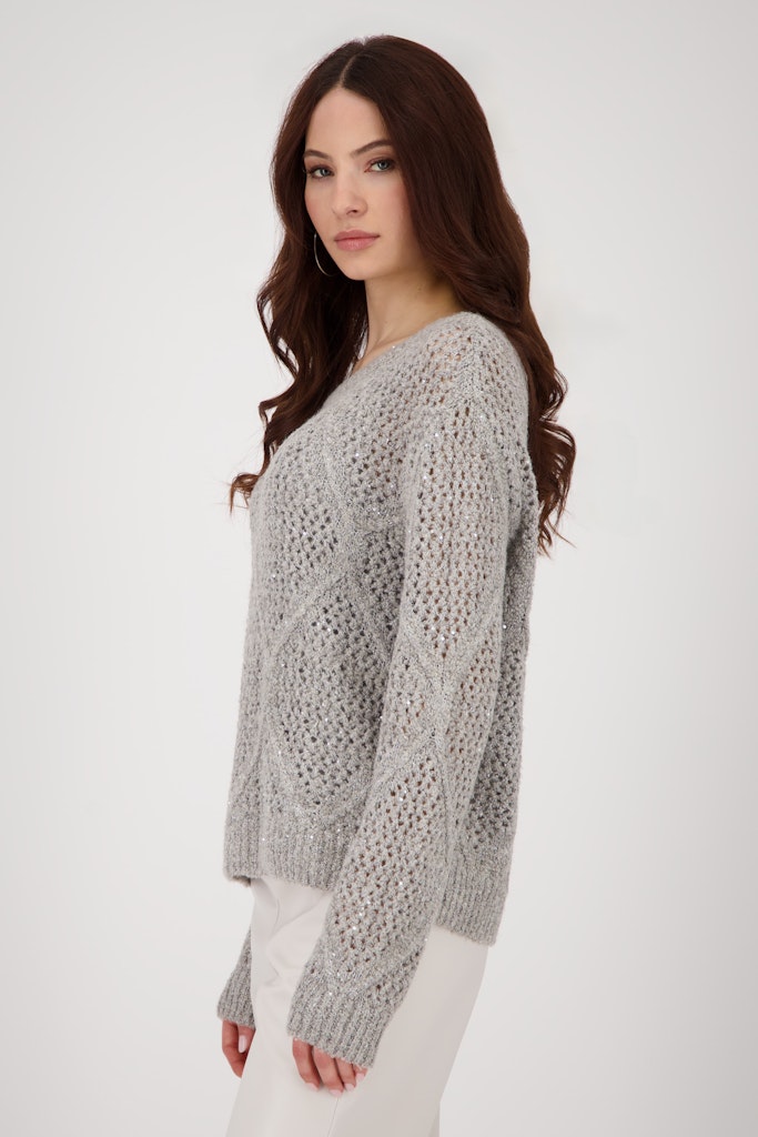Eleganter Ajour-Pullover aus hochwertiger Baumwollmischung mit fließender Viskose, glitzerndem Lurex und Pailletten. Überschnittene Schultern und feines Ajourmuster verleihen ihm eine feminine, stilvolle Ausstrahlung.