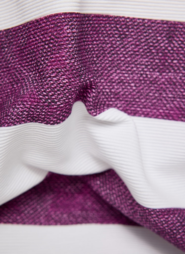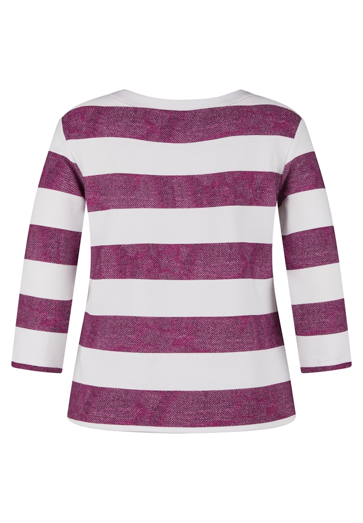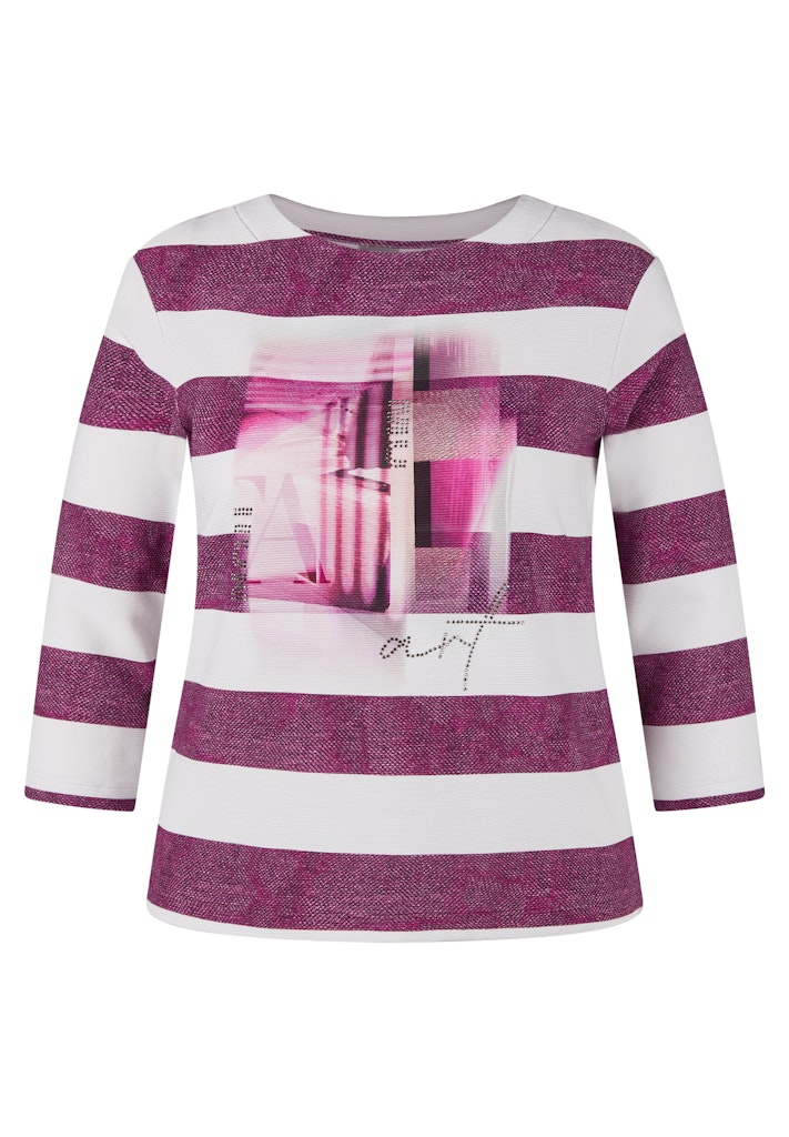 Dieses Shirt überzeugt mit einem sportlich-modernen Look. Die strukturierte Ware mit breiten Blockstreifen wird durch einen platzierten Fotodruck und feine Ziersteine auf der Vorderseite aufgewertet. Der U-Boot-Ausschnitt unterstreicht den femininen Stil, während der Elasthananteil für angenehmen Tragekomfort sorgt. Ideal für lässige Freizeit-Outfits. Pflegeleichtes Material. U-Boot-Ausschnitt. Dekorative Ziersteine. Bequeme 3/4-Ärmel. Druck vorne.