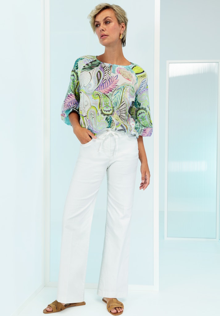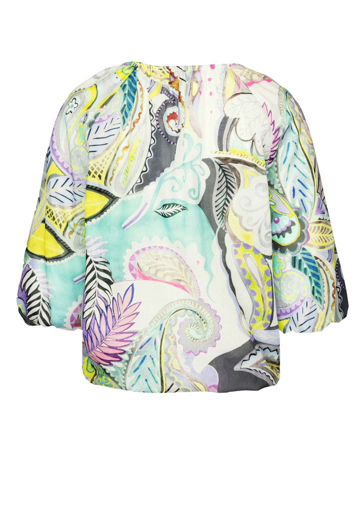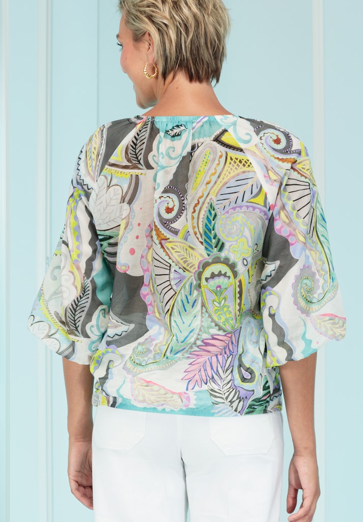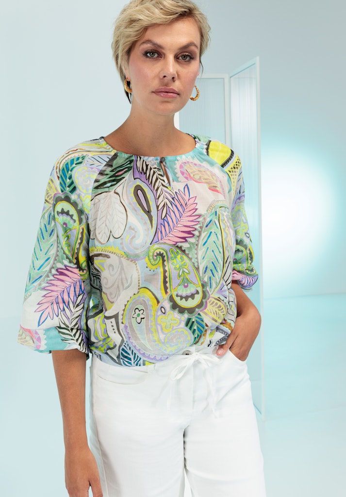 Unsere coole Druckbluse Rana bringt mit ihrem sommerlichen Allover-Print frische Leichtigkeit in Ihre Garderobe. Der Rundhalsausschnitt mit kleinem Knopfverschluss und die locker fallende Passform sorgen für eine feminine Silhouette, während der Gummizug am Saum eine lässige Form verleiht. Der 3/4-Arm macht sie zum perfekten Begleiter für warme Tage. Ideal kombinierbar mit Jeans oder leichten Stoffhosen - für einen entspannten und stilvollen Look!