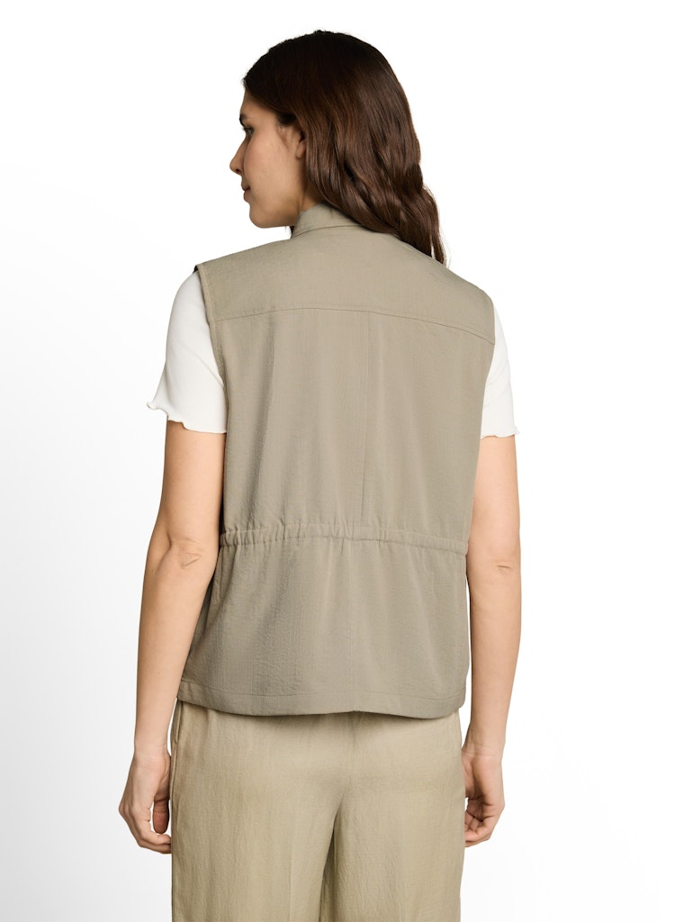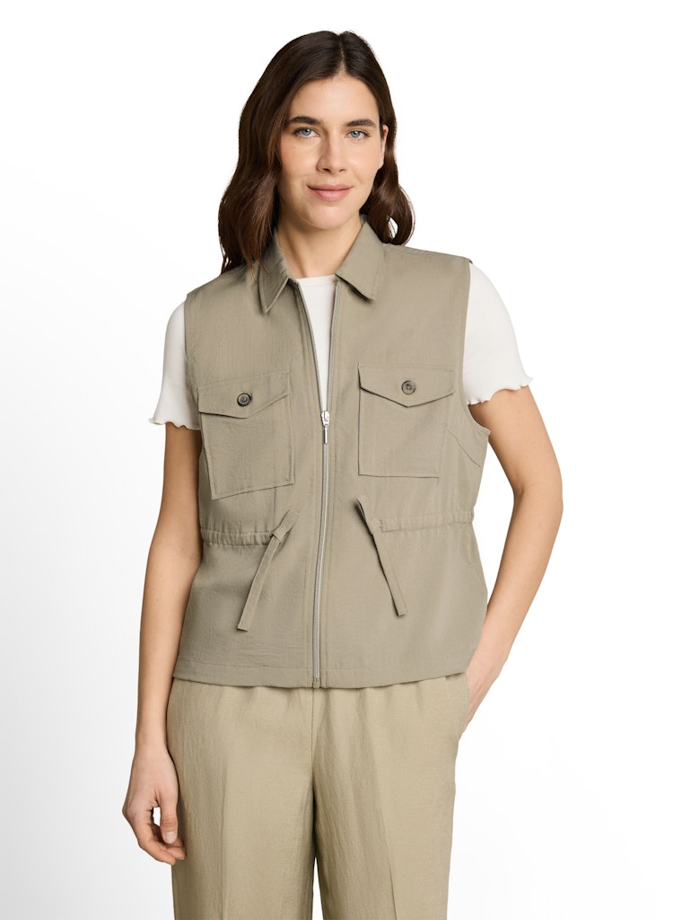 Blazer-Weste mit Reißverschluss und aufgesetzten Brusttaschen mit Patte. Mit einem verstellbaren Kordelzug in der Hüfte. Aus einem Voile-Gewebe mit Viskose.