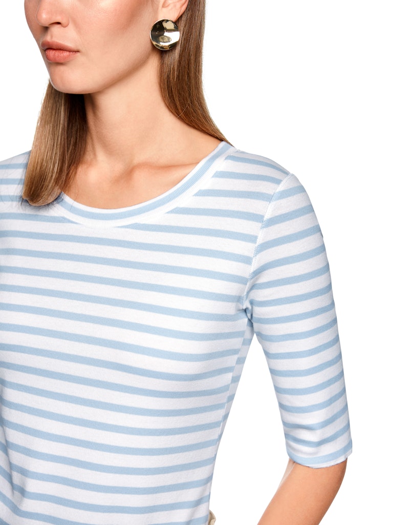 Ringel-T-Shirt aus Baumwoll-Ripp|Schmal geschnittenes T-Shirt aus stretchigem Baumwoll-Ripp. Das Modell hat ein rundes Dekolletee und 3/4-Ärmel. Der Ringel ist allover. Ein toller Basic für sportive Looks.|Schmal geschnitten|Rundes Dekolletee|3/4-Ärmel|Allover-Dessin|Das Model ist 179 cm groß und trägt N3/38.