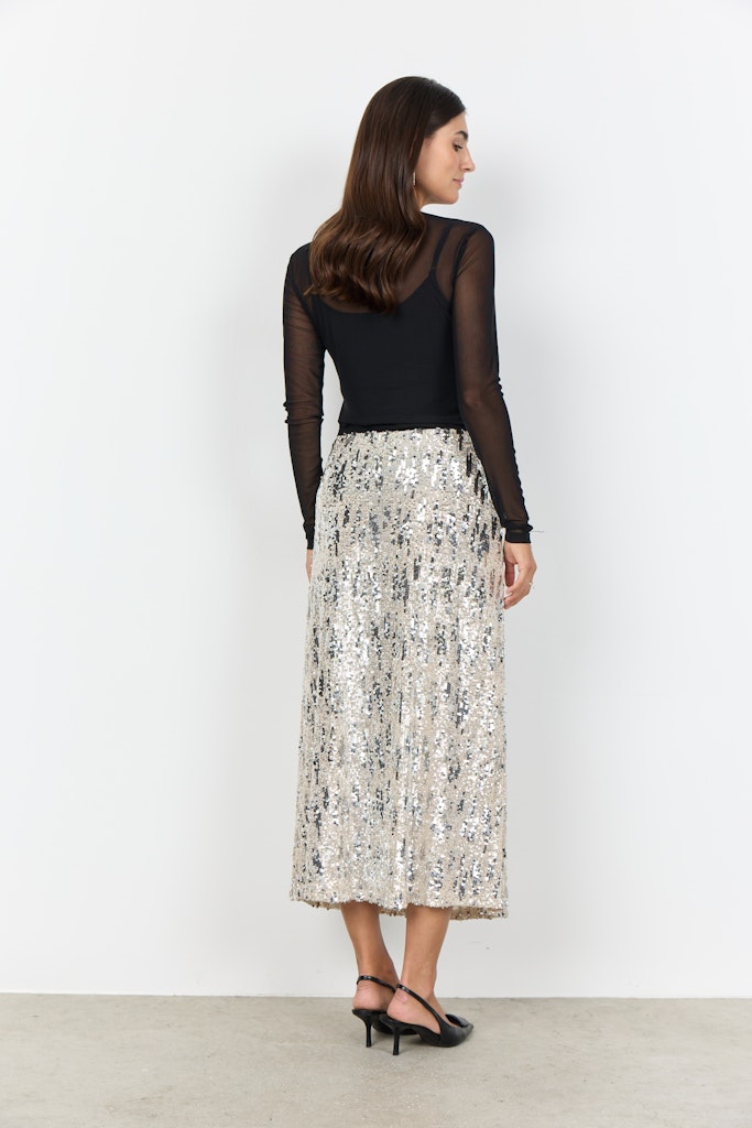 SC-ANGEL 3 ist ein Rock aus 94% Polyester, 6% Elastan. Dieser elegante Rock mit knielangem Schnitt ist mit Pailletten besetzt. Kombiniere ihn mit einer taillierten Bluse und hohen Schuhen für einen eleganten Look.