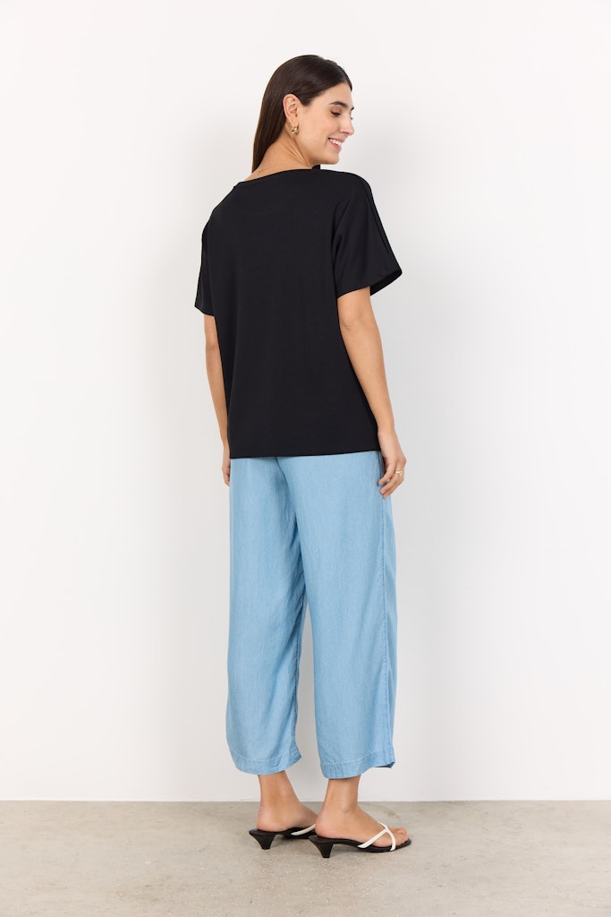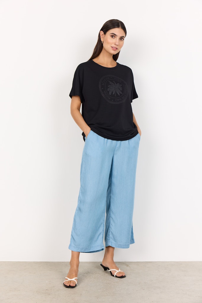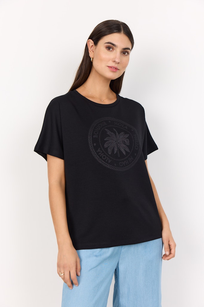 SC-BANU 230 ist ein bequemes T-Shirt aus einer Mischung aus 48% Modal, 48% Polyester und 4% Elastan. Das T-Shirt hat einen Rundhalsausschnitt, kurze Ärmel und einen zentralen, kreisförmigen Grafikdruck mit Grußworten in verschiedenen Sprachen, die ein Blumenmotiv umrahmen. Kombiniere es mit einer lässigen Hose für einen entspannten Look oder trage es unter einer Jacke für einen strukturierten Look.