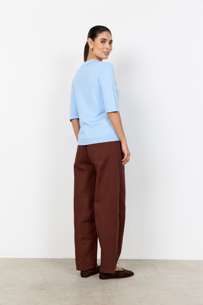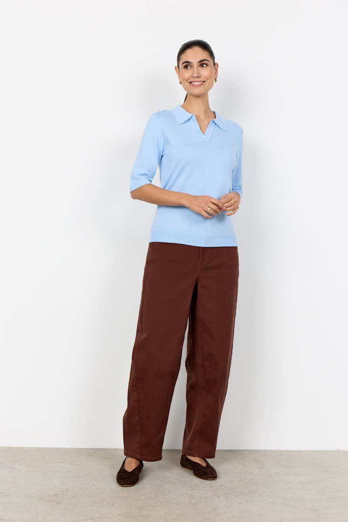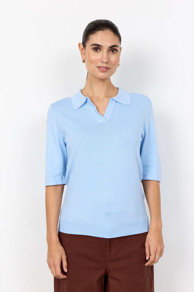 SC-DOLLIE 817 ist ein Pullover aus 75% Viskose, 25% Nylon. Er hat einen raffinierten Kragen, kurze Ärmel und eine saubere, glatte Textur. Kombinieren Sie ihn mit einer maßgeschneiderten Hose oder einem eleganten Rock für einen eleganten Look.