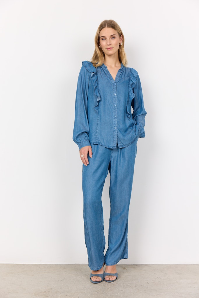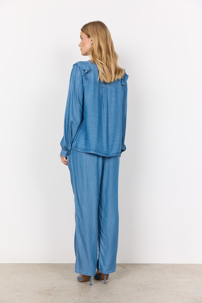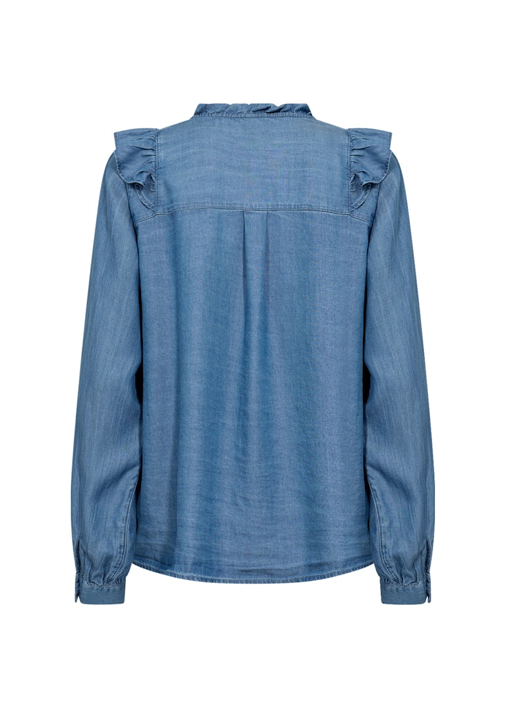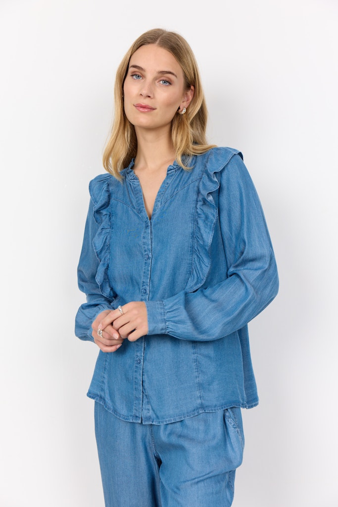 SC-LIV 51 ist ein langärmeliges Denim-Shirt aus 100% Lyocell. Es hat Rüschendetails an der Schulternaht, einen V-Ausschnitt und einen Knopfverschluss. Für einen cleanen Look kann es mit einer maßgeschneiderten Hose oder einer passenden Jeans kombiniert werden.