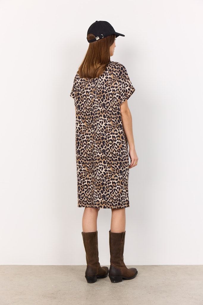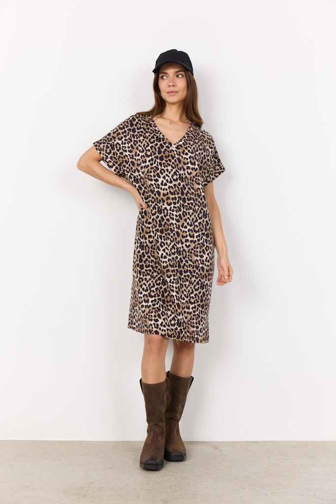 SC-OPHIA 11 ist ein Kleid mit V-Ausschnitt, das aus einer bequemen Mischung aus 75% Modal, 20% Polyester und 5% Elastan besteht. Dieses knielange Kleidungsstück hat einen auffälligen Tierprint, kurze Ärmel und einen geraden Saum. Es lässt sich mit Absätzen und Accessoires aufpeppen oder lässig mit flachen Schuhen zu verschiedenen Anlässen tragen.