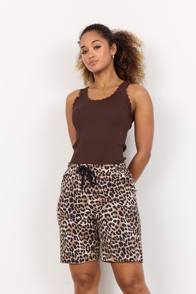 SC-OPHIA 12 ist ein Paar Shorts mit einer Zusammensetzung aus 75% Modal, 20% Polyester, 5% Elastan. Das Produkt verfügt über einen elastischen Bund mit Kordelzug und ist mit einem Tierprintmuster verziert. Sie kann mit einem einfachen Oberteil und Turnschuhen für einen lässigen Tag kombiniert werden oder mit einem Blazer für einen Abend-Look aufgepeppt werden.