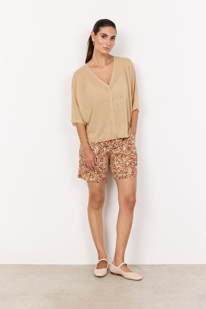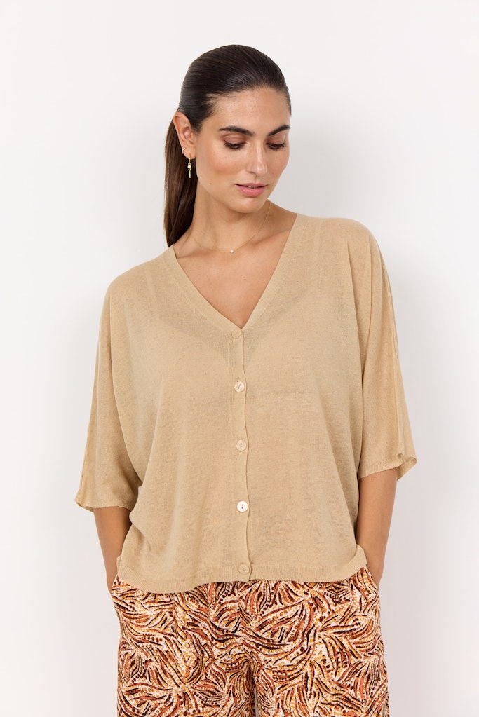 SC-RIHAN 2 ist eine leichte Strickjacke mit einer Zusammensetzung aus 55% Acryl, 30% Lyocell, 15% Leinen. Diese Strickjacke hat einen V-Ausschnitt mit zentralem Knopfverschluss und eine lockere Passform mit dreiviertellangen Ärmeln. Kombiniere sie mit deiner Lieblingsjeans für einen lässigen Look oder trage sie über einem Kleid für einen eleganten Look.