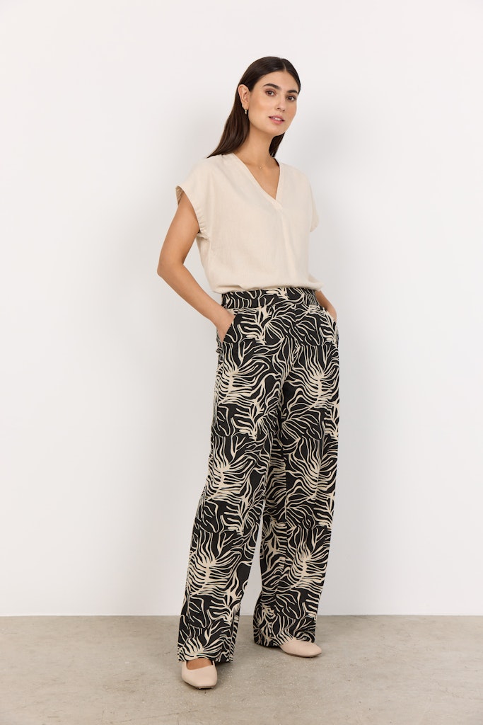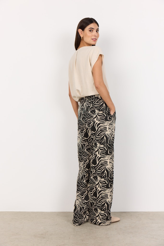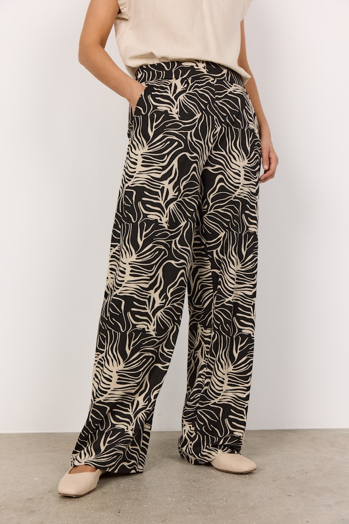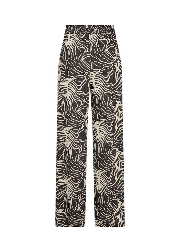 SC-RITZA 4 ist eine Hose aus 100 % Bio-Baumwolle. Das Design umfasst einen geraden Schnitt und ein Muster, das an Baumzweige erinnert. Diese Hose kann mit einem unifarbenen Oberteil kombiniert werden, um einen ausgewogenen Look für verschiedene Anlässe zu erzielen.