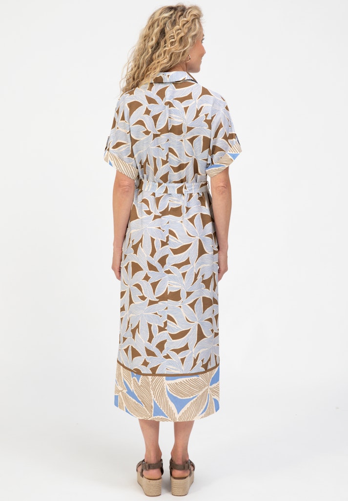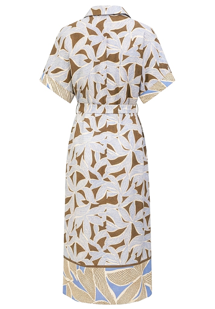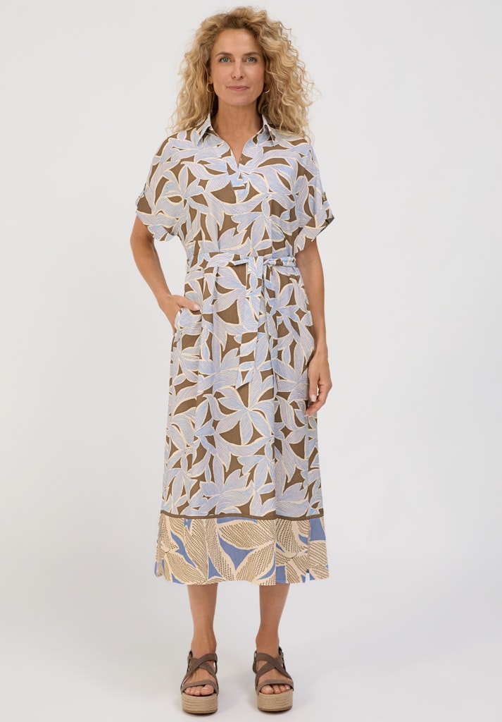 Unser Sommerkleid Selma überzeugt mit einem lebendigen Allover-Print in einer modernen Trendfarbe. Eine kontrastierende Bordüre am Saum setzt einen stilvollen Akzent. Mit Hemdblusenkragen, überschnittenen Kurzärmeln und passendem Stoffgürtel erhält das Kleid eine feminine, entspannte Silhouette. Seitliche Saumschlitze bieten zusätzliche Bewegungsfreiheit. Der hochwertige Viskose-Mix ist ungefüttert, weich und angenehm zu tragen, perfekt für warme Tage.