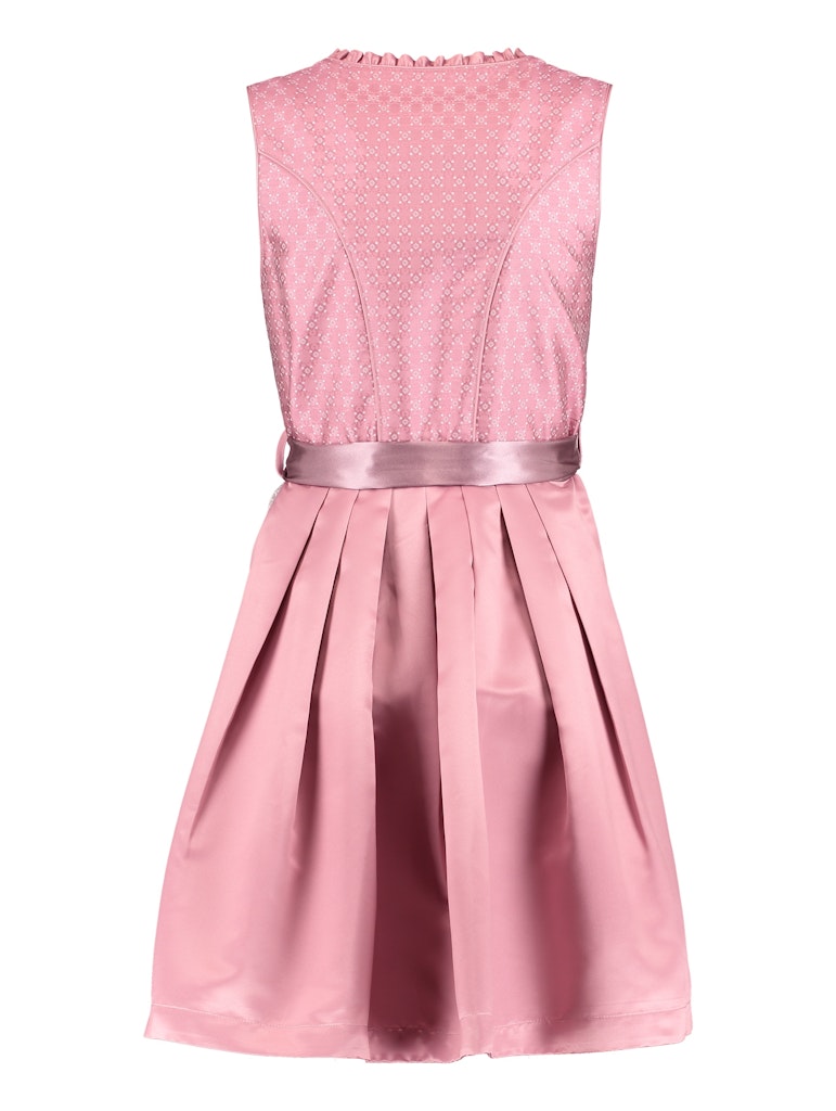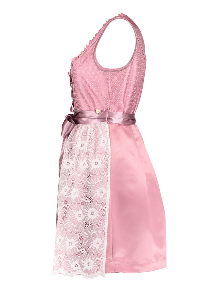 Dirndl ohne Ärmel, mit eckigem Ausschnitt und Raffungen. Verdecktem Reißverschluss sowie Schnürdetail in der Korsage. Schleife in der Taille und Spitzenlage im vorderen Rockteil.