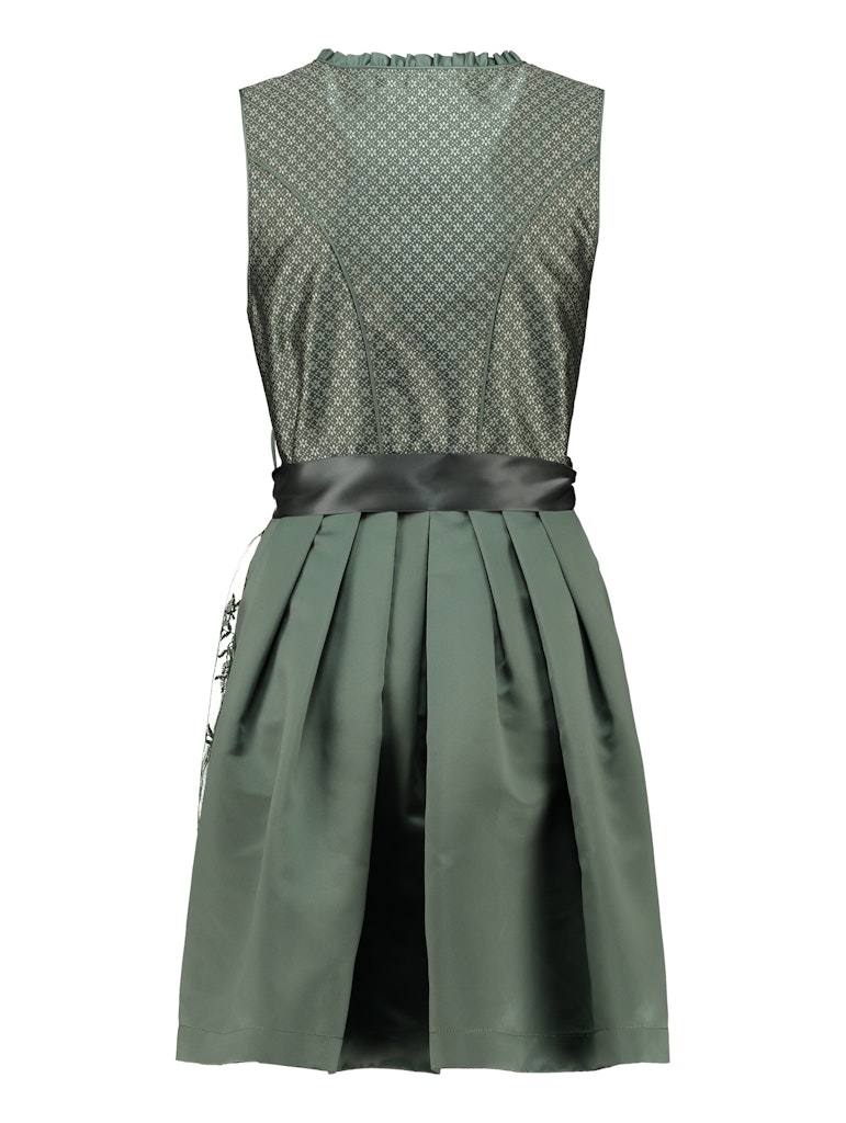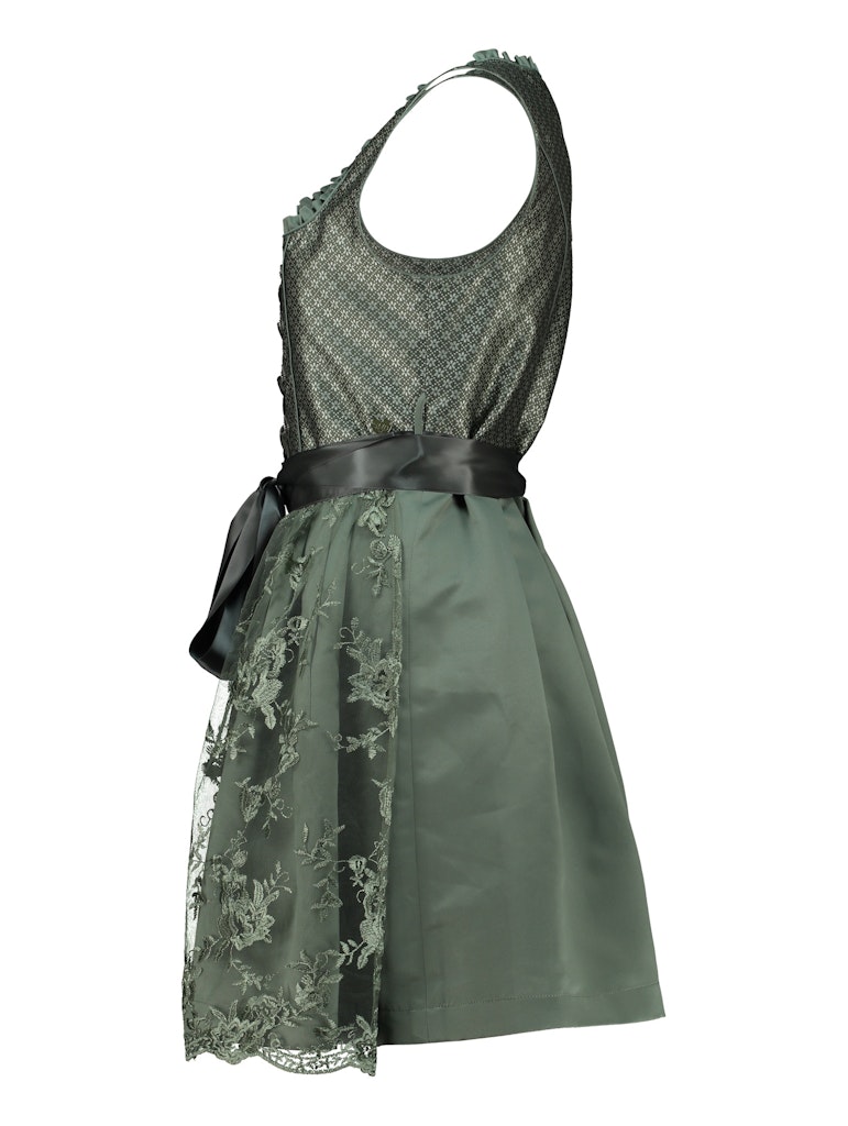 Dirndl ohne Ärmel, mit eckigem Ausschnitt und Raffungen. Verdecktem Reißverschluss sowie Schnürdetail in der Korsage. Schleife in der Taille und Spitzenlage im vorderen Rockteil.