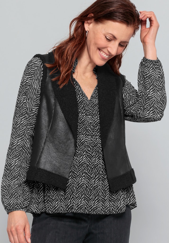 Lässig und stylisch - unsere coole Fellimitat-Weste Sophie überzeugt mit weicher Shearling-Optik und Reverskragen. Formgebende Teilungsnähte und der praktische Haken- und Ösenverschluss setzen modische Akzente. Die gerade und lockere Passform sorgt für angenehmen Tragekomfort. Pflegeleicht und vielseitig kombinierbar, ein Must-Have für coole Layer-Looks.