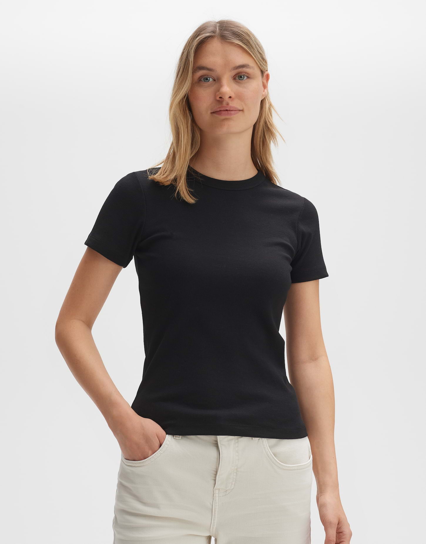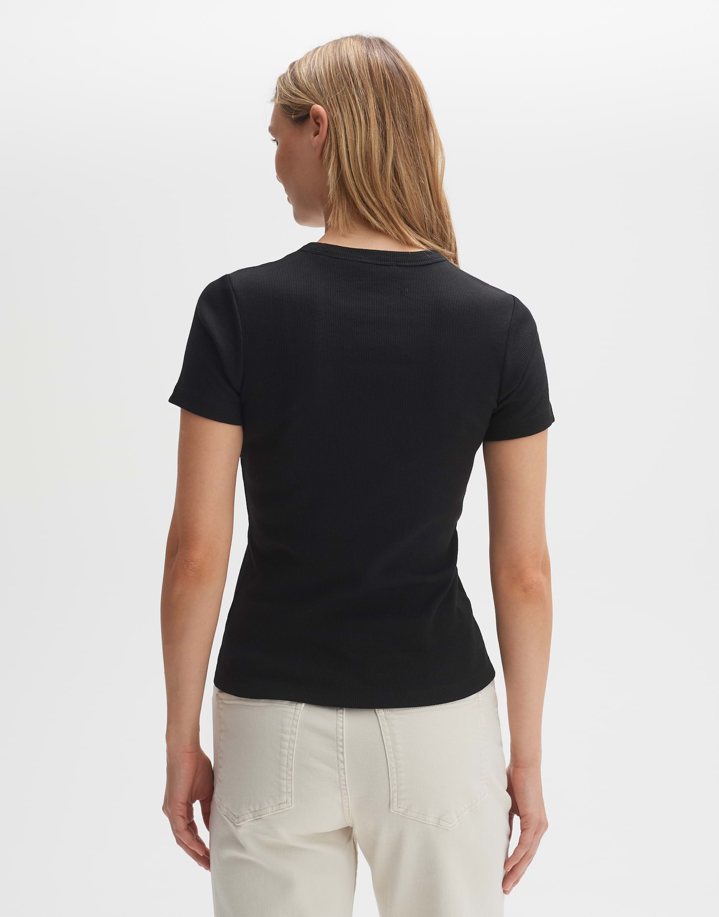schmale Passform, Kurzarm, Rundhalsausschnitt, Rückenlänge ca. 58 cm bei Größe 36, Model Größe 179 cm - trägt Größe 36, BCI Cotton-Mix, Jersey, Rippstruktur, elastischer Stoff