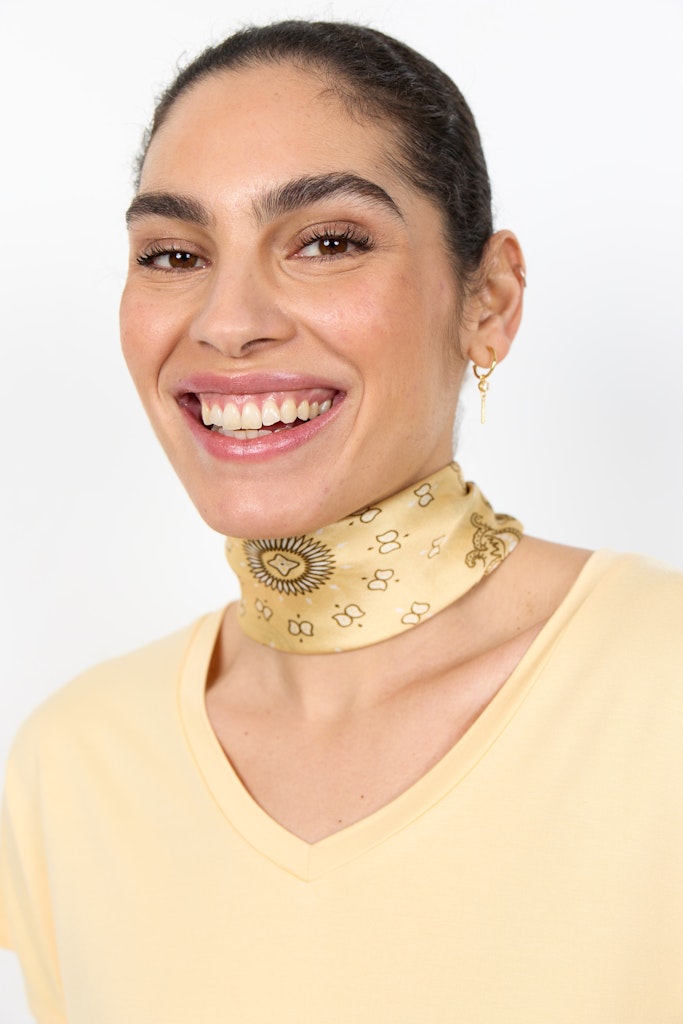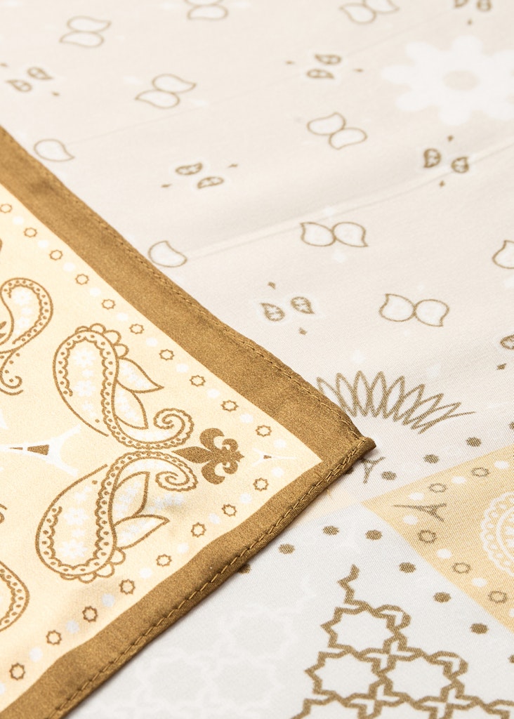 SC-FLICKA 1 ist ein Halstuch aus 100% Seide. Der Schal hat ein elegantes Muster mit geometrischen Formen und Paisleymotiven, das mit einem glatten Rand versehen ist. Kombinieren Sie ihn mit einer maßgeschneiderten Jacke oder einer einfachen Bluse für einen raffinierten Look.