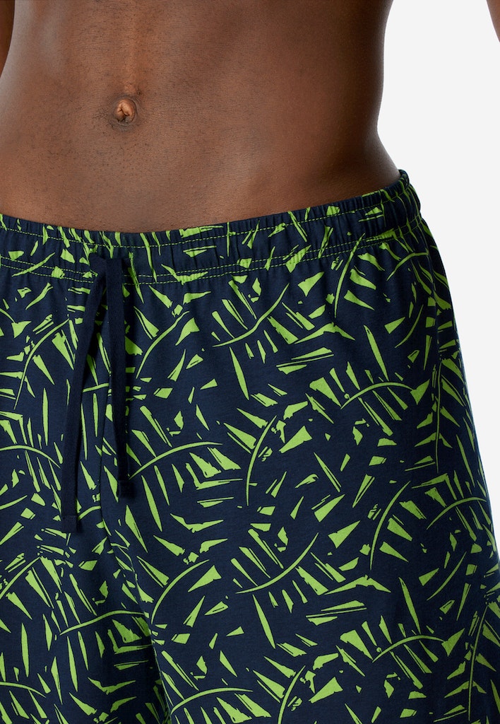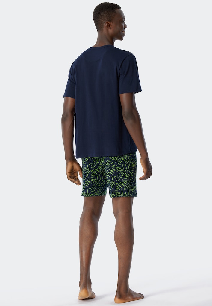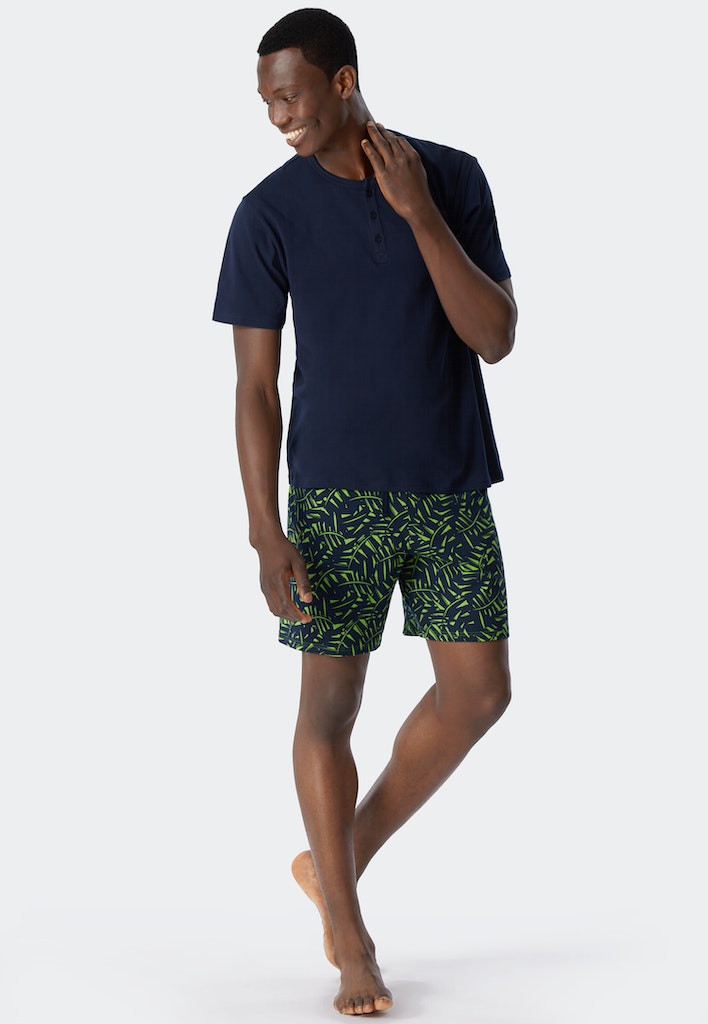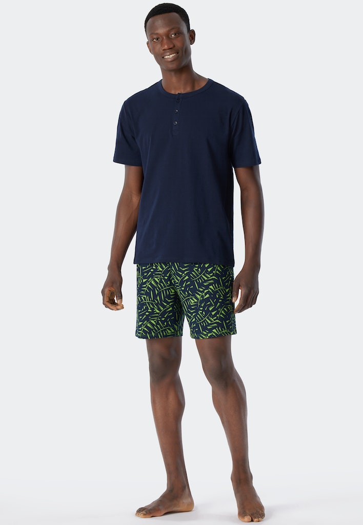 Freuen Sie sich auf einen kurzen Herren-Schlafanzug mit angesagtem Print und in elastischem Single-Jersey. Dieser Zweiteiler mit Bio-Baumwolle ist ein echter Hingucker und überzeugt mit höchstem Tragekomfort. Mit dem Serafino-Kragen samt Knopfleiste bekommt das unifarbene T-Shirt modische Details. Die Shorts mit Blätter-Design und praktischem Bindeband machen das lässige Nachtwäsche-Duo in bester SCHIESSER-Qualität komplett!
