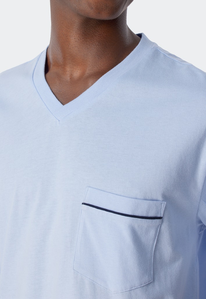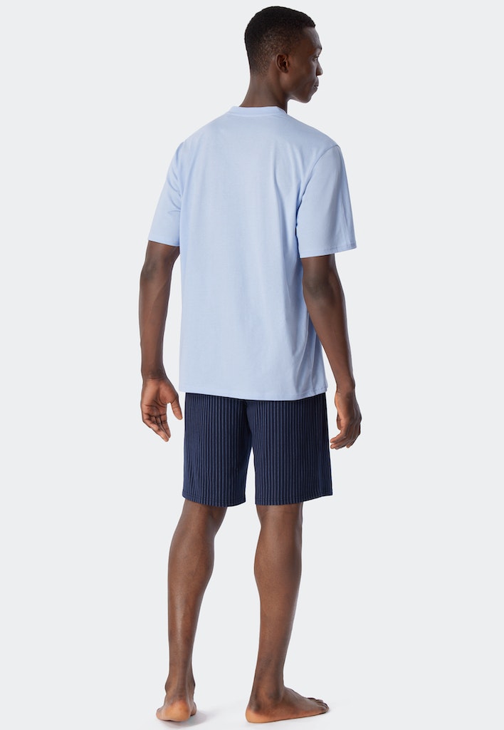 Freuen Sie sich auf einen Herren-Schlafanzug im modischen Design und in softer Single-Jersey-Qualität. Dieser kurze Zweiteiler aus 100 % Baumwolle ist ein echter Hingucker und überzeugt mit höchstem Tragekomfort. Mit der aufgesetzten Brusttasche und V-Ausschnitt bekommt das unifarbene T-Shirt topaktuelle Details. Die gestreiften Shorts und der bequeme Bund machen das lässige Nachtwäsche-Duo in bester SCHIESSER-Qualität komplett! Auch in großen Größen erhältlich.
