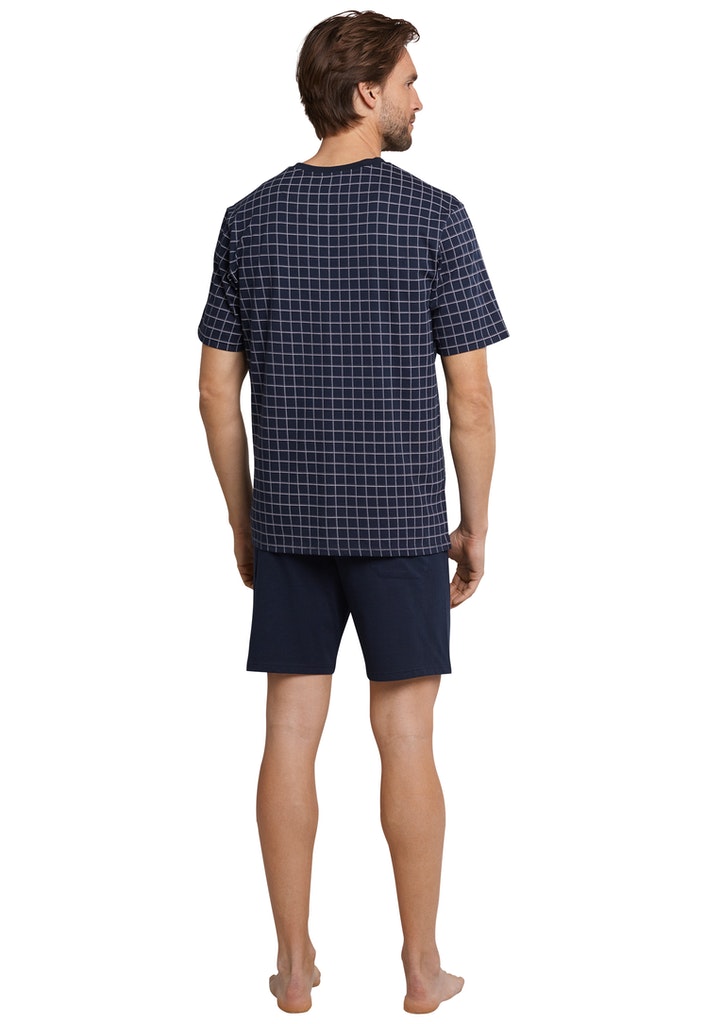Dieser kurze Herrenschlafanzug kombiniert hohen Tragekomfort mit einem stilvollen Design. Feiner Single Jersey aus 100% Baumwolle fühlt sich dabei angenehm weich an und kann mit dem grau-weißen Karo-Muster des Oberteils auch optisch punkten. Der dunkelblau abgesetzte V-Ausschnitt, eine aufgesetzte Brusttasche und die Gesäßtasche auf den uni-dunkelblauen Shorts setzen dezente Details. Ein bequemer, lockerleichter Zweiteiler in bester SCHIESSER-Qualität!