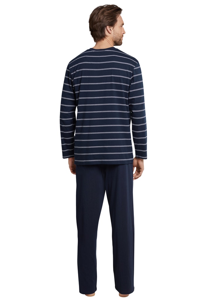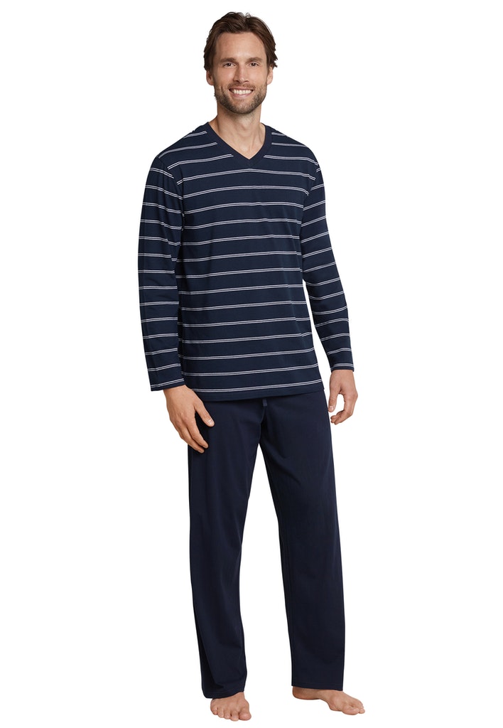 Dieser lange, dunkelblaue Herrenschlafanzug verspricht angenehme Nächte in 100% weicher Baumwolle. Weiße, gestrickte Ringel und der dunkelblau akzentuierte V-Ausschnitt schenken dem Oberteil einen sportlichen Look, der perfekt durch die lange, dunkelblaue Hose mit Bindeband am Bund und Gesäßtasche abgerundet wird. Ein unkomplizierter, bequemer Schlafanzug in bester SCHIESSER-Qualität - auch in besonderen Größen erhältlich!