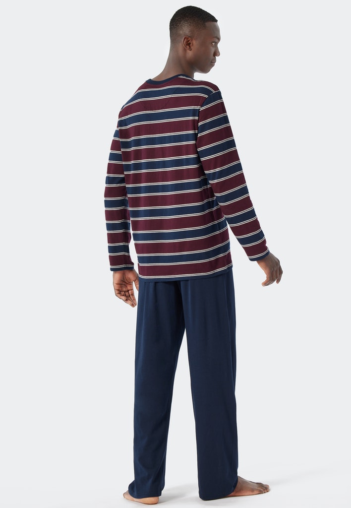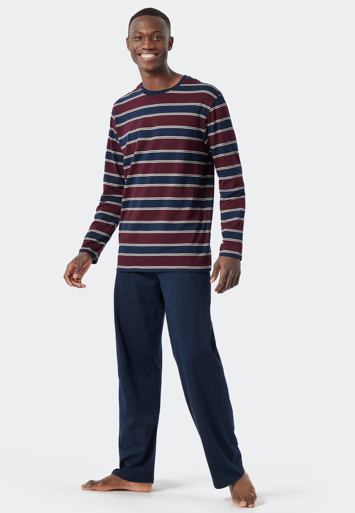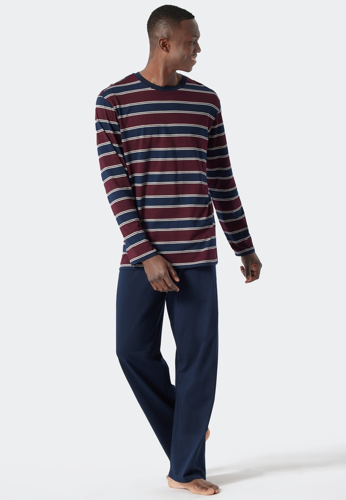langer Schlafanzug für Herren mit gestreiftem Shirt in Burgund, Blau, Weiß und Grau, aus der SCHIESSER-Serie "Comfort Fit", Langarmshirt mit unifarbenem, eingefasstem Rundhalsausschnitt, lange, dunkelblaue Hose, hoher Tragekomfort dank 100% hautfreundlicher, schnelltrocknender Baumwolle, auch in speziellen Größen erhältlich, in angenehm weicher Single-Jersey-Qualität