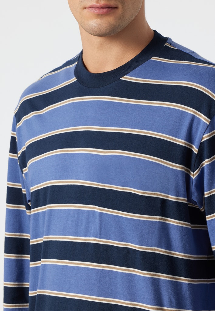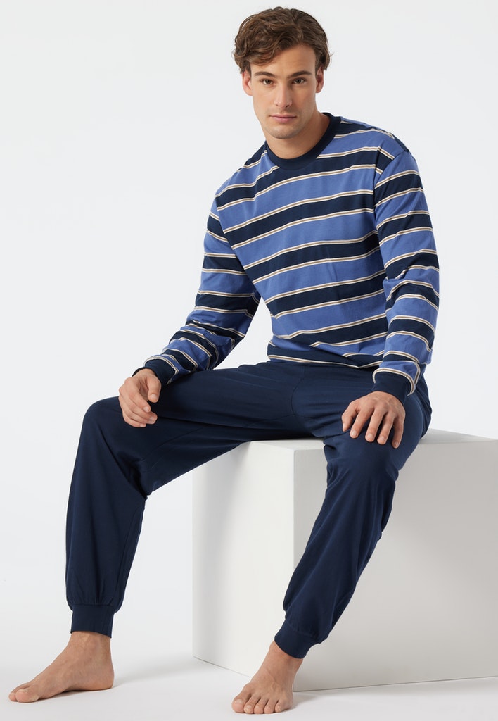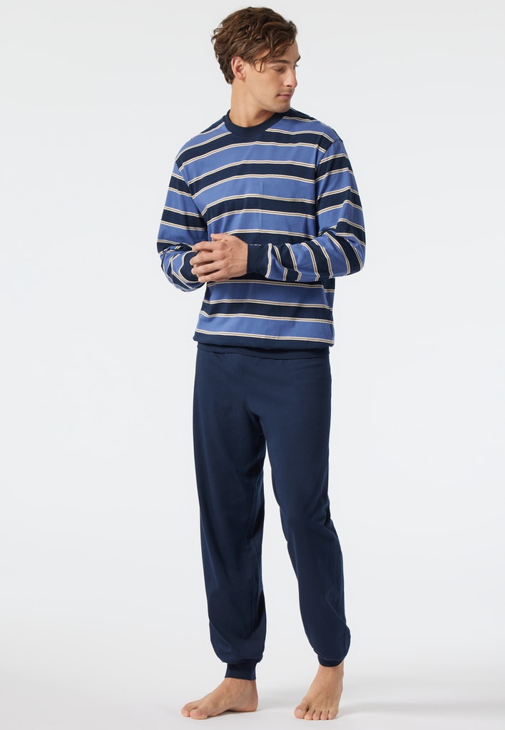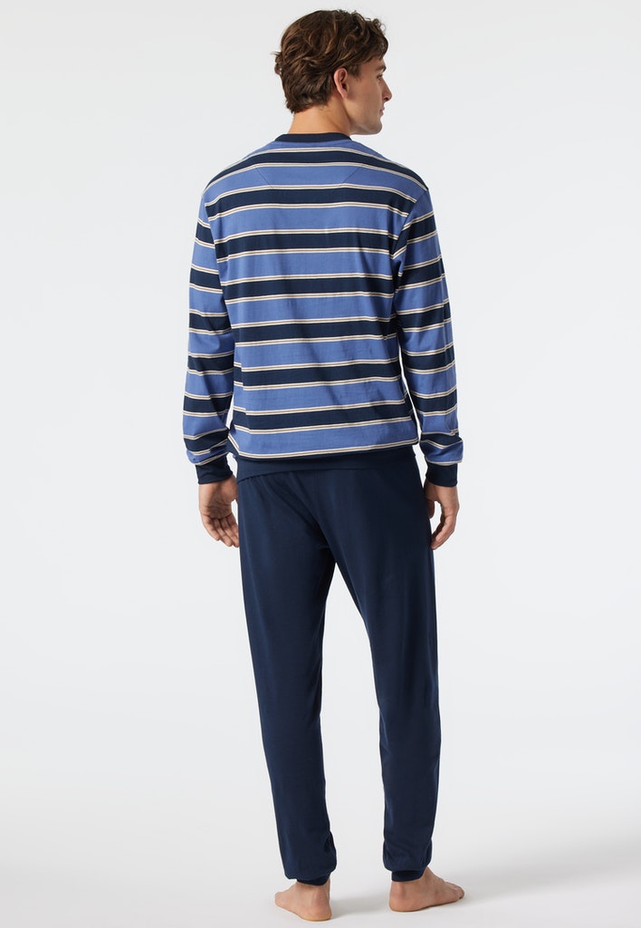 langer Schlafanzug für Herren mit gestreiftem Shirt in Jeansblau, Dunkelblau, Weiß und Grau , aus der SCHIESSER-Serie "Comfort Fit", Langarmshirt mit unifarbenem, eingefasstem Rundhalsausschnitt, lange, dunkelblaue Hose , bequeme, unifarbene Bündchen am Saum sowie den Ärmel- und Beinabschlüssen, auch in speziellen Größen erhältlich , in angenehm weicher Single-Jersey-Qualität aus 100% Baumwolle