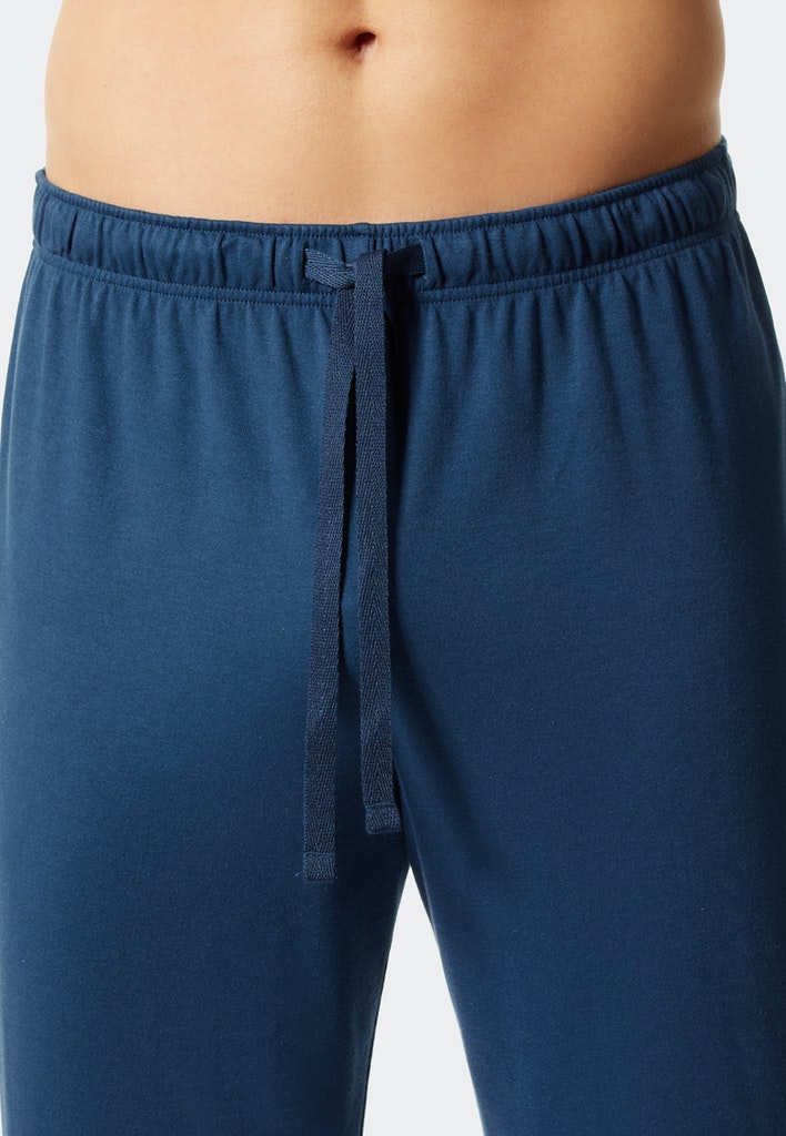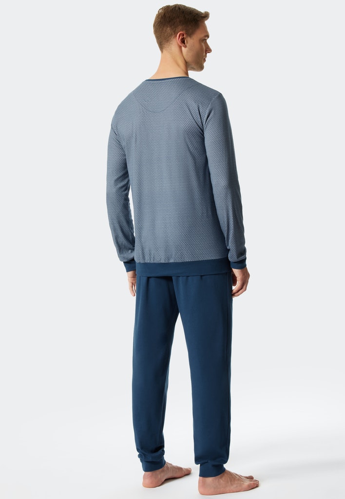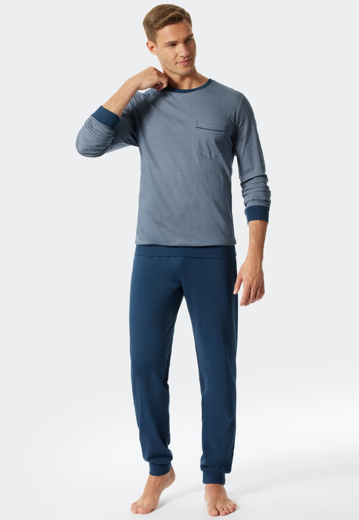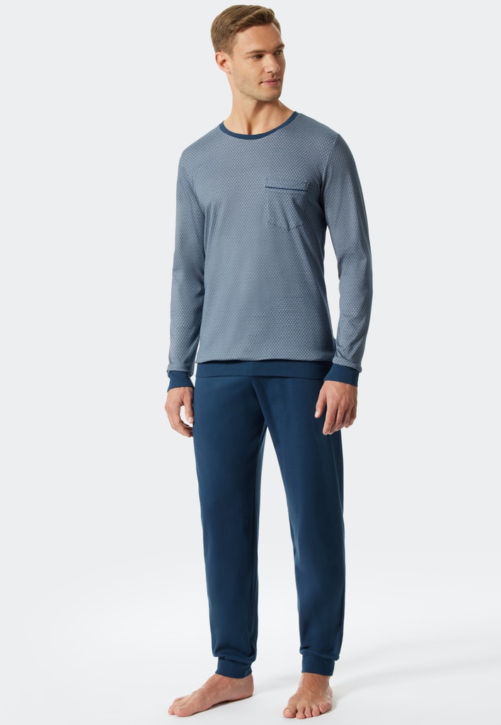 langer blauer Schlafanzug für Herren mit gemustertem Oberteil und unifarbener Hose, aus der SCHIESSER-Serie "Fine Interlock", Oberteil mit grafischem Minimal-Print, unifarbener, eingefasster Rundhalsausschnitt und aufgesetzte Brusttasche mit blauer Ziernaht , einfarbige Hose mit tonalem Bindeband, bequeme, unifarbene Bündchen am Saum sowie den Ärmel- und Beinabschlüssen, in angenehm softer Feininterlock-Qualität // erhältlich auch in speziellen Größen