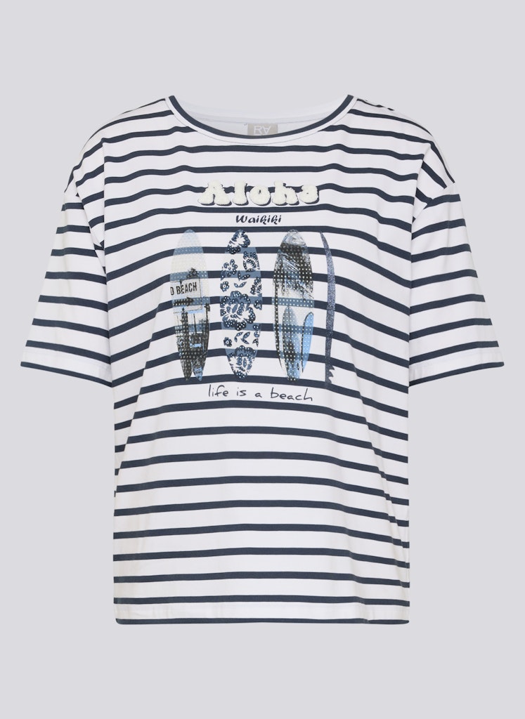 Das sommerliche Frontmotiv wird durch feine Strassdetails und glänzende Elemente akzentuiert und zieht dezent die Blicke auf sich. Das klassische Streifenmuster verleiht dem Shirt eine maritime Note. Die gerade, komfortable Passform eignet sich für vielseitige Kombinationen im Alltag. Rundhalsausschnitt und kurze Ärmel runden den unkomplizierten Stil ab. Baumwollmix mit Stretch. Streifenmuster. Frontprint mit Strass. Rundhalsausschnitt. Gerade Passform.