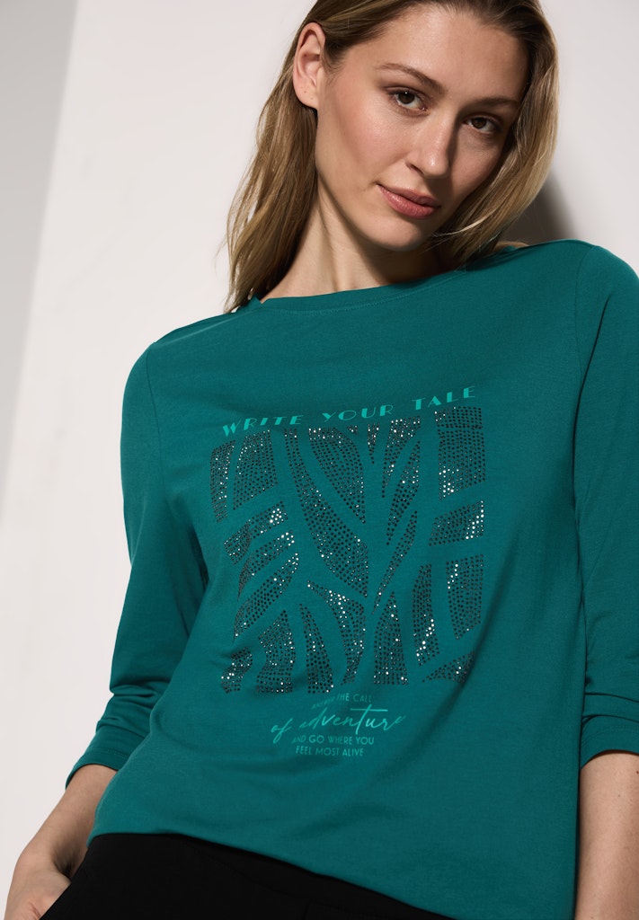 Dieses Shirt mit Glitzer-Motiv von CECIL für Damen setzt mit dem funkelnden Design und dem femininen U-Boot-Ausschnitt Akzente. Der Materialmix mit Stretchanteil und die 3/4-Ärmel bieten dir einen hohen Tragekomfort. Damenshirt U-Boot-Ausschnitt 3/4-Arm Glitzerndes Motiv Materialmix mit Stretchanteil Material: 47% Baumwolle, 47% Modal, 6% Elasthan