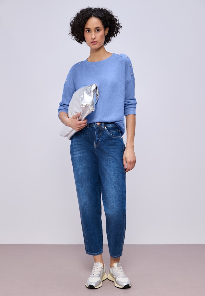 Dieses Shirt im sportiven Look von Street One für Damen setzt mit Knopfdetails auf den Schultern feine Akzente. Der elastische Saum mit Tunnelzug sorgt für einen bequemen Sitz und lässt sich individuell anpassen. Der Viskosemix mit Stretchanteil ist angenehm zu tragen. Ein stilvoller Alltagsbegleiter in Unifarbe mit raffiniertem Detail. Strick-Look Shirt Casual U-Boot-Ausschnitt 3/4-Arm Sportiv Material: 50% Viskose, 47% Polyester, 3% Elasthan