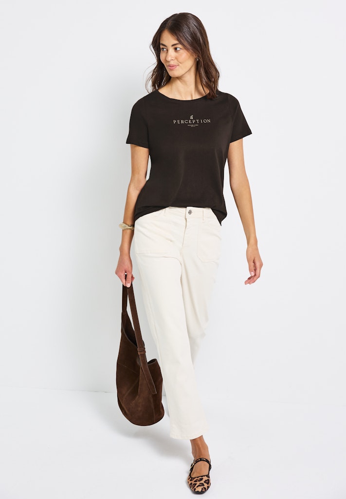 Mit modischem Wording Artwork und softer Baumwollqualität wird dieses T-Shirt von Street One für Damen zu deinem neuen Lieblingsstück. Der klassische Rundhalsausschnitt und die kurzen Ärmel machen es vielseitig kombinierbar – ob lässig zu Denim oder zu Röcken. Der reine Baumwollstoff garantiert dabei ein besonders angenehmes Tragegefühl. T-Shirt Rundhalsausschnitt Kurzarm Feminines Wording Artwork Reine Baumwolle Material: 100% Baumwolle