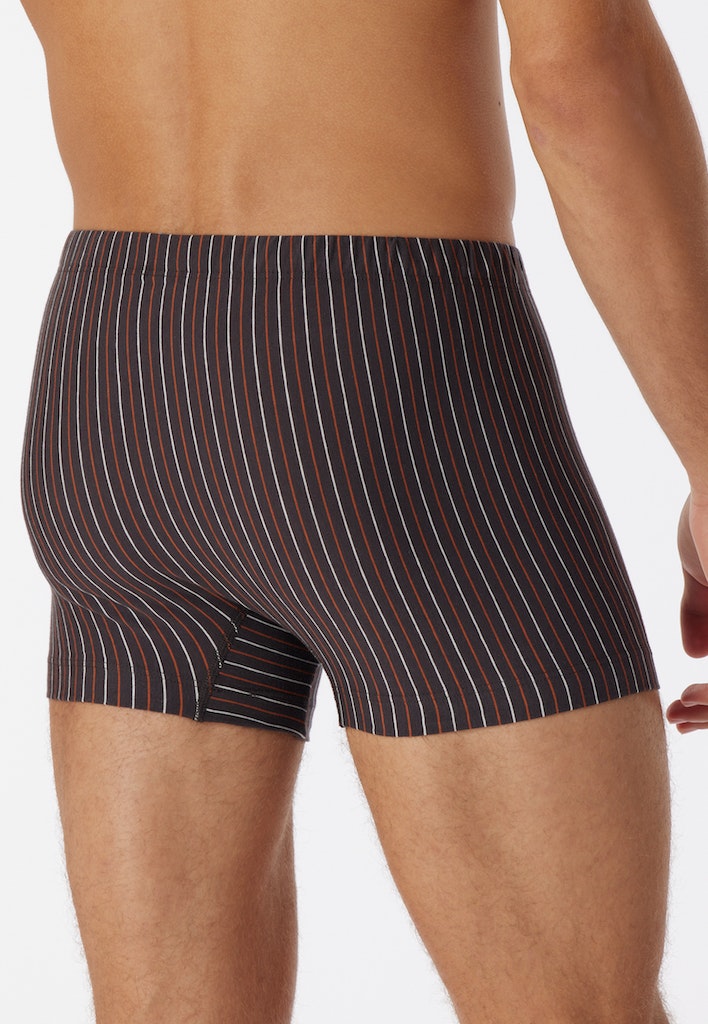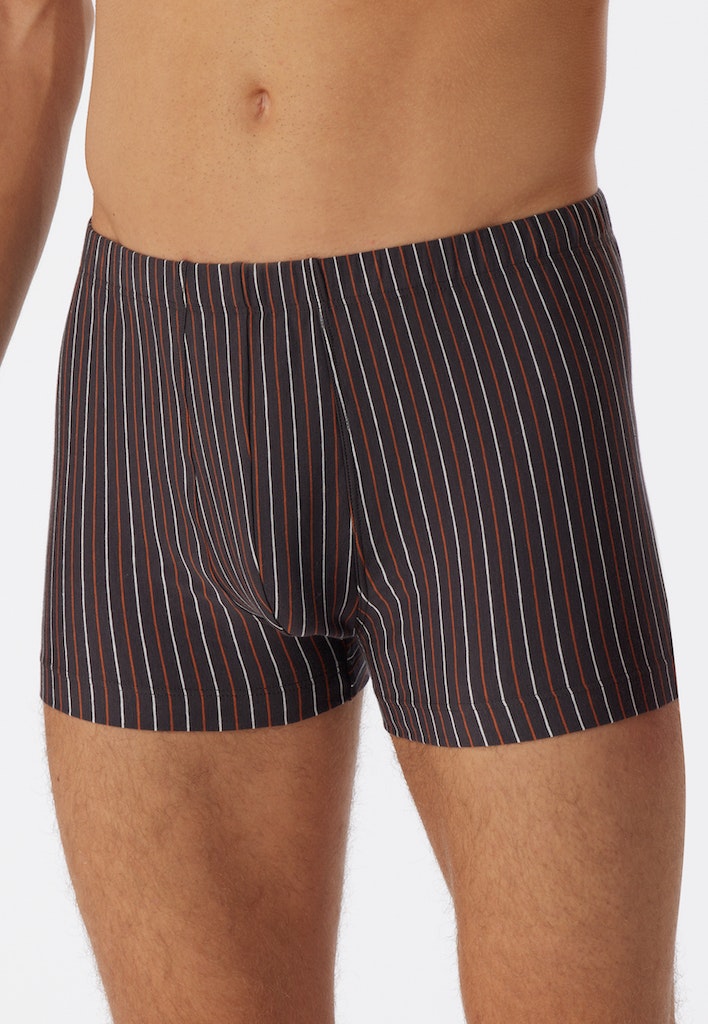 grau melierte Shorts für Herren mit Streifen, aus der beliebten SCHIESSER Serie "95/5", innen liegender Webgummibund, hochwertig garngefärbt für ein durchgängig kontrastreiches Streifen-Design, angenehm weich und formstabil dank 95% natürlichem Organic Cotton und 5% Elastan, unser Model ist 186 cm groß und trägt Größe 50/M, in perfekt sitzender, elastischer Single-Jersey-Qualität