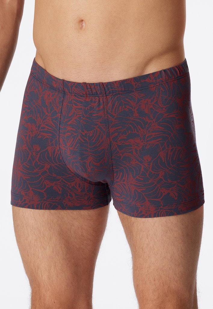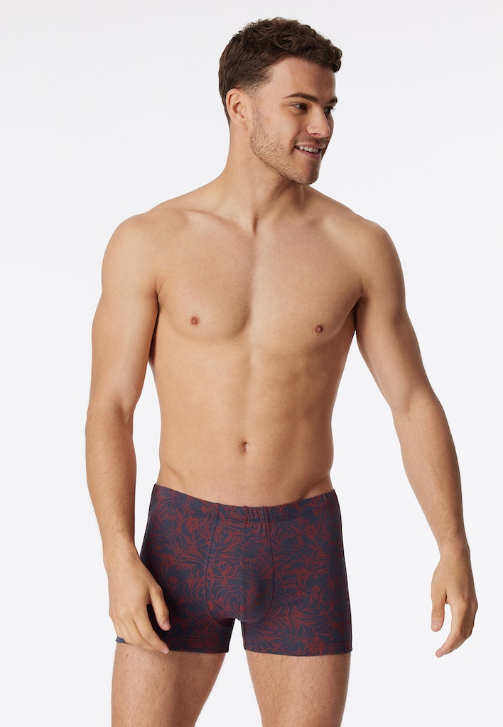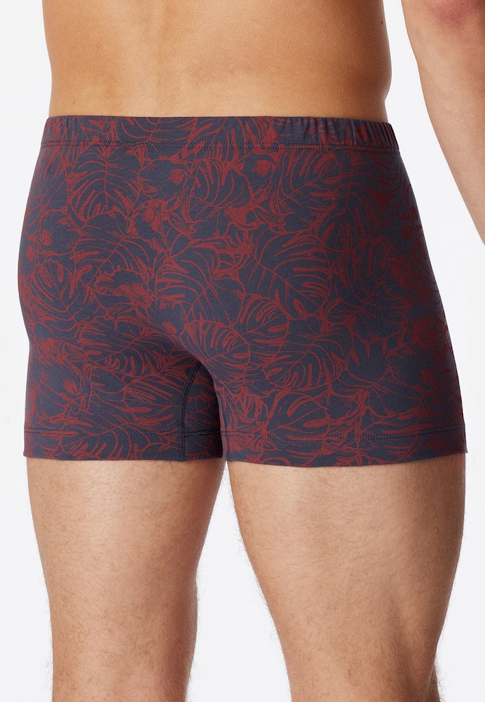 graue Herren-Shorts mit tropischem Blättermuster in Orange, aus der beliebten SCHIESSER Serie "95/5", mit softem, tonalem Komfortbund, extra bequemer, köperbetonter Schnitt, angenehm weich und formstabil dank 95% Bio-Baumwolle und 5% Elastan, unser Model ist 187 cm groß und trägt Größe 50/M, in perfekt sitzender, elastischer Single-Jersey-Qualität